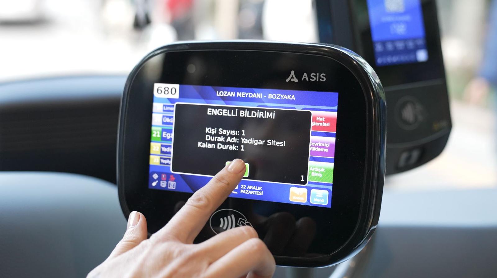 “Duraktayım” uygulaması sayesinde durakta bekleyen tekerlekli sandalyeli yurttaşlar, ESHOT Mobil üzerinden şoföre bildirim gönderiyor. Bildirim, doğrudan şoför ekranına yansıyor ve şoför durağa yaklaşmadan önce yolcunun durumunu görerek aracı rampanın güvenli şekilde açılabileceği noktada durduruyor. Görme engelli yurttaşların sesli komutlarla durak ve hat seçimi yapabildiği, dış anons sistemiyle aracı tespit edebildiği uygulama, yapılan son güncellemeyle birlikte tekerlekli sandalye kullanıcıları için de aktif olarak kullanılmaya başlandı.
