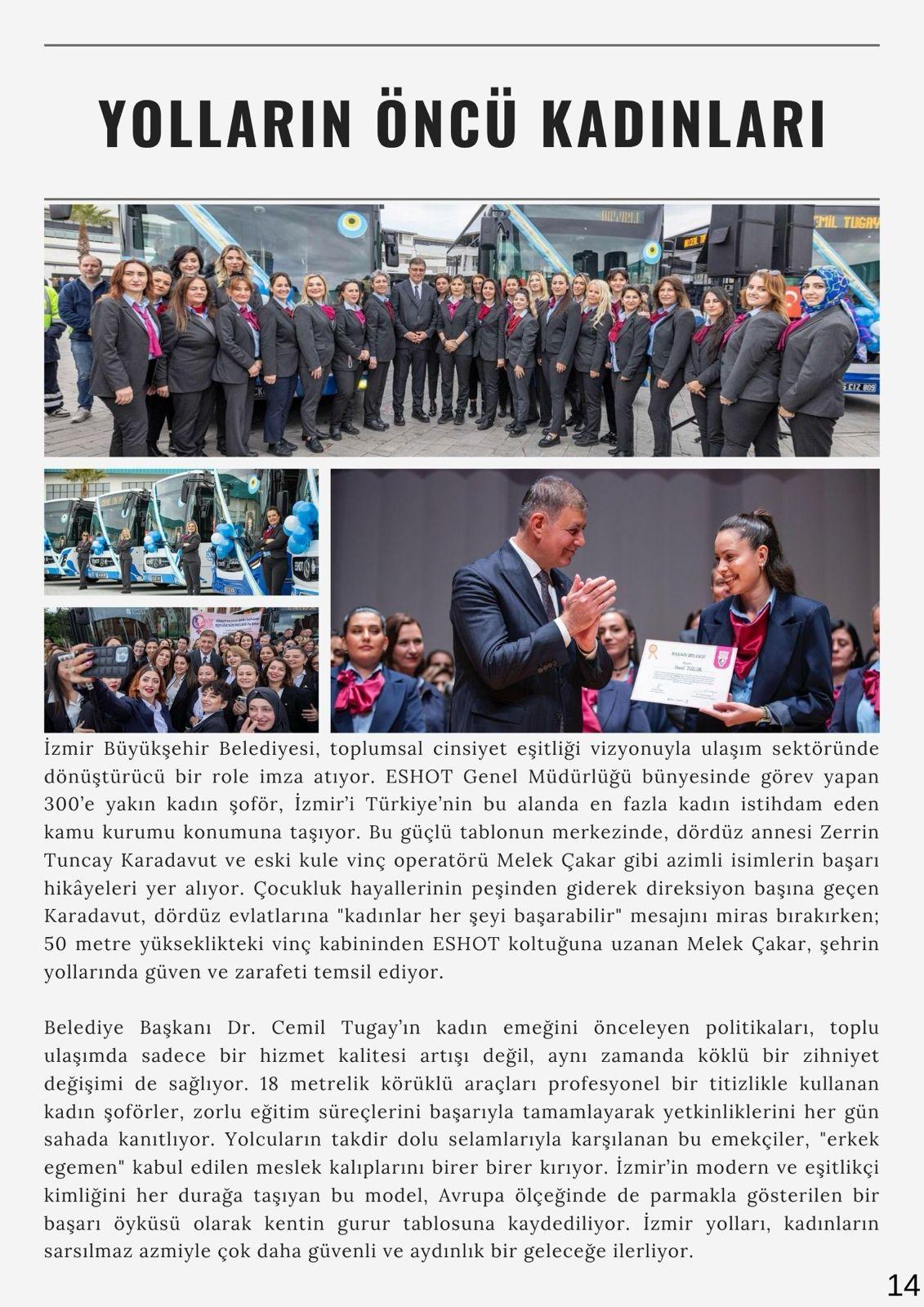 İzmir Büyükşehir Belediye Başkanı Dr. Cemil Tugay’ın eşit yurttaşlık, kapsayıcı sosyal belediyecilik ve çocuk dostu kent çalışmaları doğrultusunda hazırlanan Hep Birlikte İzmir bülteninin yeni sayısında 8 Mart Dünya Emekçi Kadınlar Günü kapsamında gerçekleştirilen etkinlikler geniş yer tutuyor. “Aramızda Eşitlik Var” temasıyla düzenlenen programlar, kadın emeğini görünür kılan buluşmalar ve toplumsal cinsiyet eşitliğini güçlendiren çalışmalar bültenin öne çıkan başlıkları arasında yer alıyor.