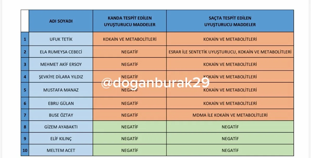 Operasyon kapsamında gözaltına alınan ve uyuşturucu madde kullandıkları tespit edilen 7 kişi şu şekilde; Ufuk Tetik, Ela Rumeysa Cebeci, Mehmet Akif Ersoy, Şevkiye Dilara Yıldız, Mustafa Manaz, Ebru Gülan, Buse Öztay. Gözaltına alınıp test veren Gizem Ayabaktı, Meltem Acet ve Elif Kılınç'ın testleri ise negatif çıktı.