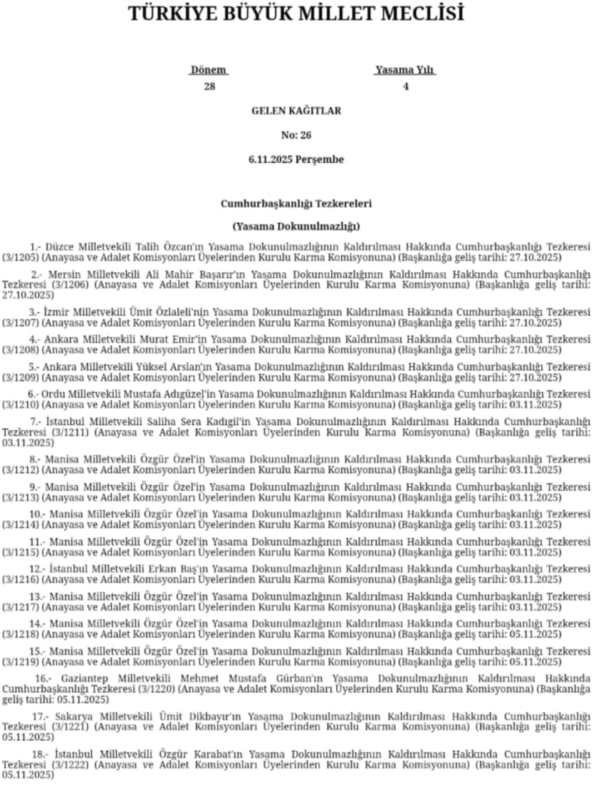 CHP Genel Başkanı Özgür Özel, TİP Genel Başkanı ve İstanbul Milletvekili Erkan Baş, CHP Grup başkanvekilleri Ali Mahir Başarır ve Murat Emir, CHP Düzce Milletvekili Talih Özcan, CHP İzmir Milletvekili Ümit Özlale, İYİ Parti Ankara Milletvekili Yüksel Arslan, CHP Ordu Milletvekili Mustafa Adıgüzel, TİP İstanbul Milletvekili Saliha Sera Kadıgil, İYİ Parti Gaziantep Milletvekili Mehmet Mustafa Gürban, CHP Sakarya Milletvekili Ümit Dikbayır ve CHP İstanbul Milletvekili Özgür Karabat. Özgür Özel'e ait 7 ayrı dokunulmazlık dosyası bulunuyor.