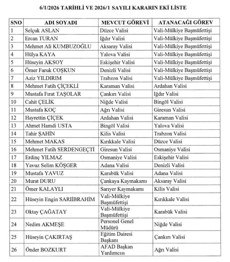 Valiler kararnamesi Resmi Gazete'de yayımlandı. 19 ile yeni vali atandı. Karar, Cumhurbaşkanı Erdoğan'ın imzasıyla Resmi Gazete'de yayımlandı.