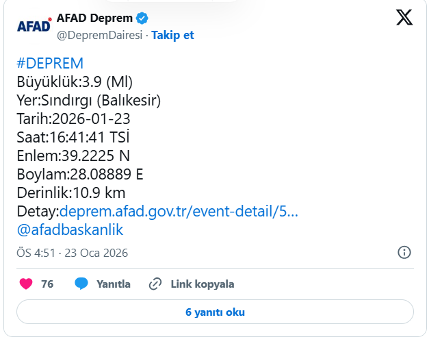 Afet ve Acil Durum Yönetimi Başkanlığı (AFAD), Balıkesir'in Sındırgı ilçesinde saat 16.41'de 3.9 büyüklüğünde bir deprem meydana geldiğini duyurdu.