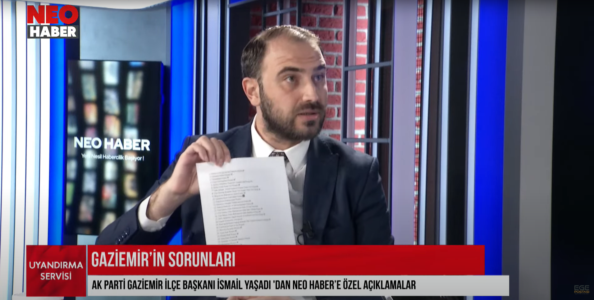 EGE POSTASI- AK Parti Gaziemir İlçe Başkanı İsmail Yaşadı, NEO Haber ekranlarında Kutluhan Nesil’in kent ve Gaziemir gündemine ilişkin sorularını yanıtladı.