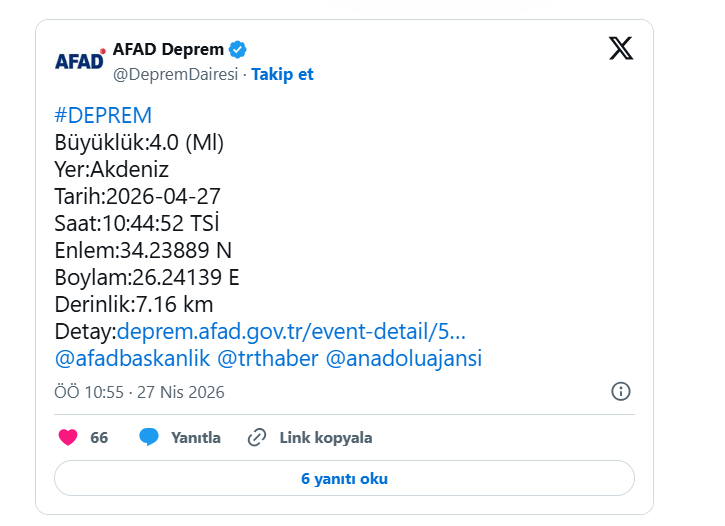 Afet ve Acil Durum Yönetimi Başkanlığının internet sitesinde yer alan bilgiye göre, Akdeniz'de 4.0 büyüklüğünde sarsıntı kaydedildi.