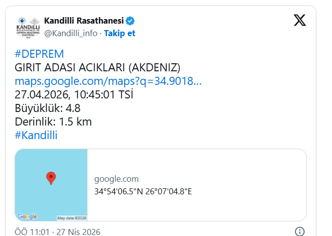 Kandilli Rasathanesi, Akdeniz'de 4.8 büyüklüğünde deprem meydana geldiğini açıkladı. Depremin yerin 1.5 kilometre derinliğinde olduğu belirtildi.