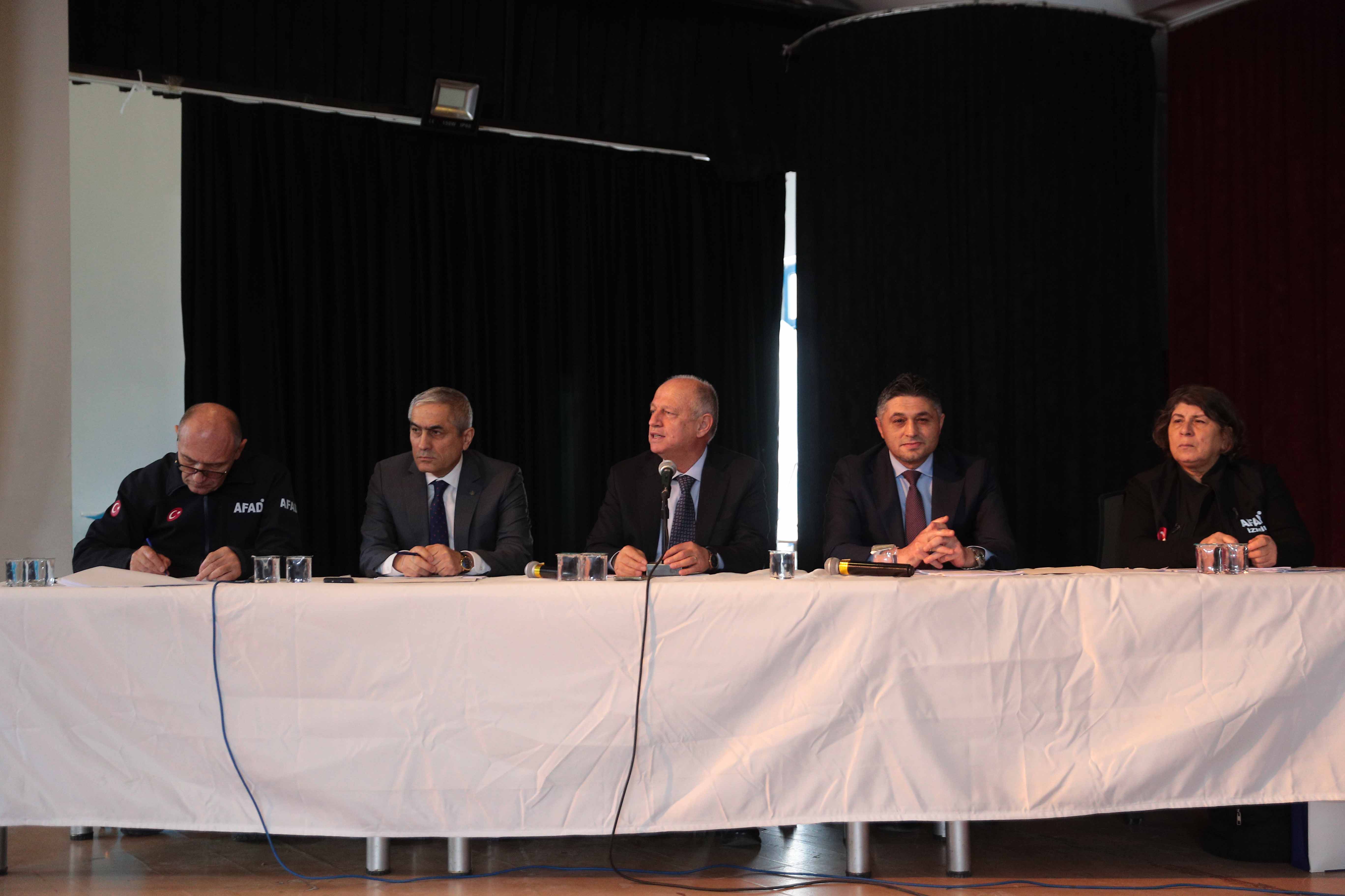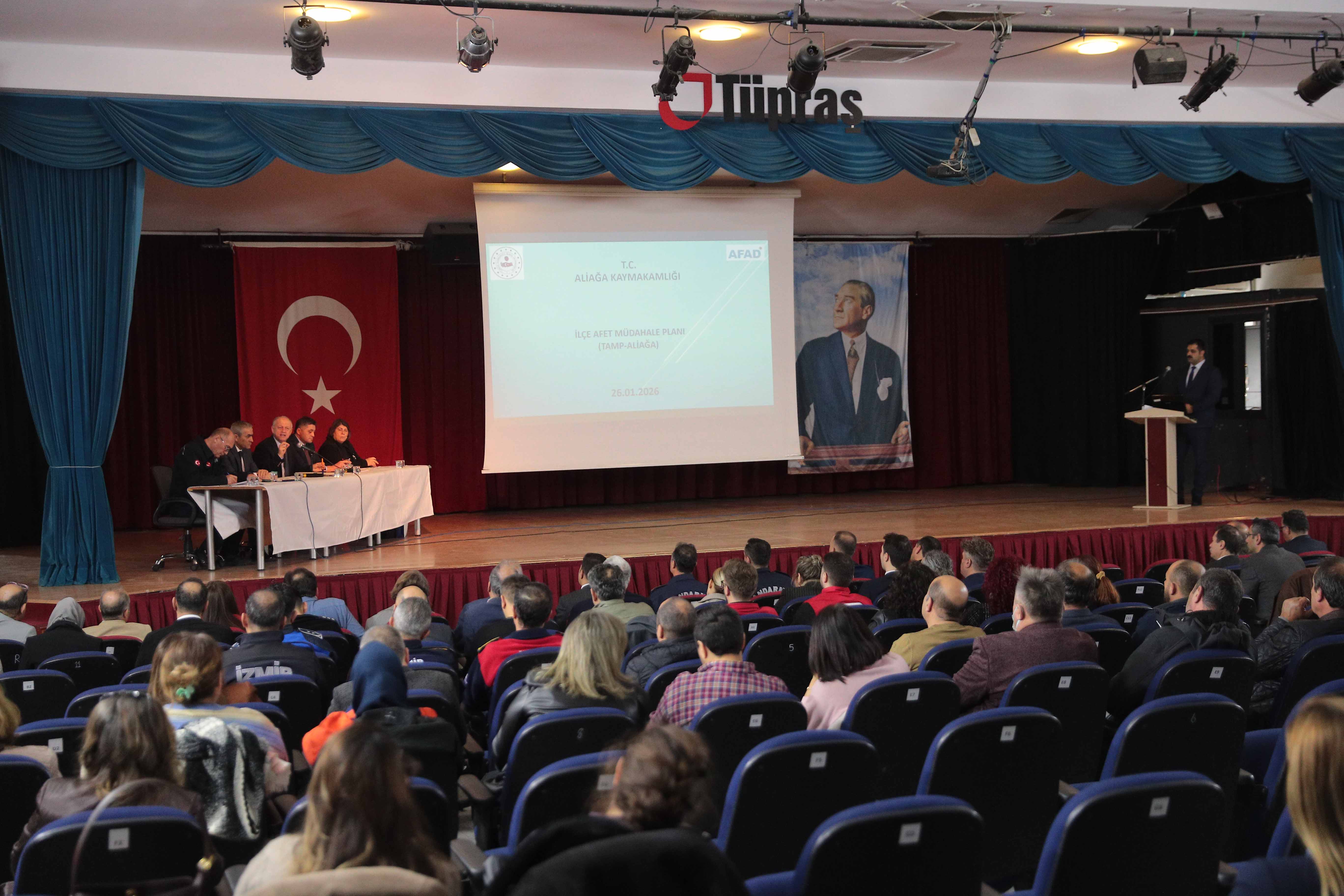 Aliağa Tüpraş Halk Eğitim Merkezi’nde gerçekleştirilen toplantıya; Vali Yardımcısı İsmail Çorumluoğlu, Aliağa Kaymakamı Zekeriya Güney, Aliağa Belediye Başkanı Serkan Acar, AFAD İl Müdürü Nazif Ekinci, AFAD Planlama ve Risk Azaltma Şube Müdürü Sezgin Kazaz, daire amirleri, muhtarlar, afet çalışma grupları ile ana çözüm ortaklarının yetkilileri katıldı.