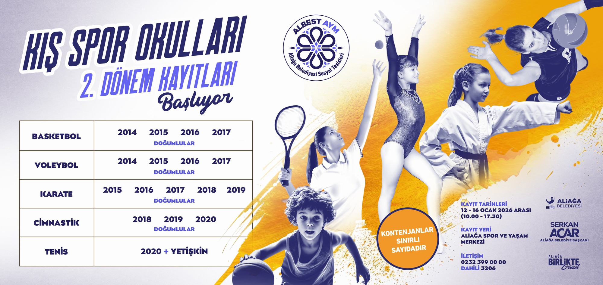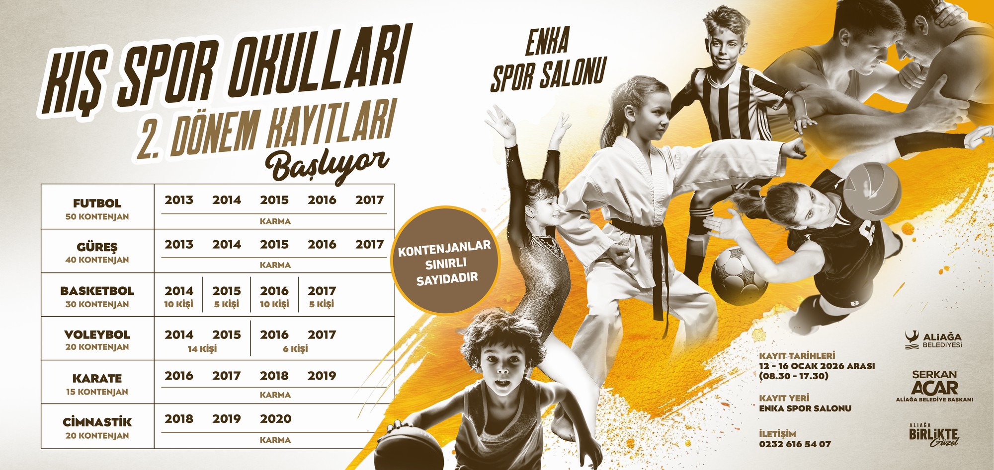 Kış Spor Okulları kapsamında eğitimler, Aliağa Belediyesi ENKA Spor Salonu ile Aliağa Spor ve Yaşam Merkezi (AYM) olmak üzere iki ayrı merkezde gerçekleştirilecek. Futboldan cimnastiğe, basketboldan tenise kadar geniş bir yelpazede sunulan spor eğitimleriyle çocukların fiziksel, zihinsel ve sosyal gelişimlerine katkı sağlanması hedefleniyor.