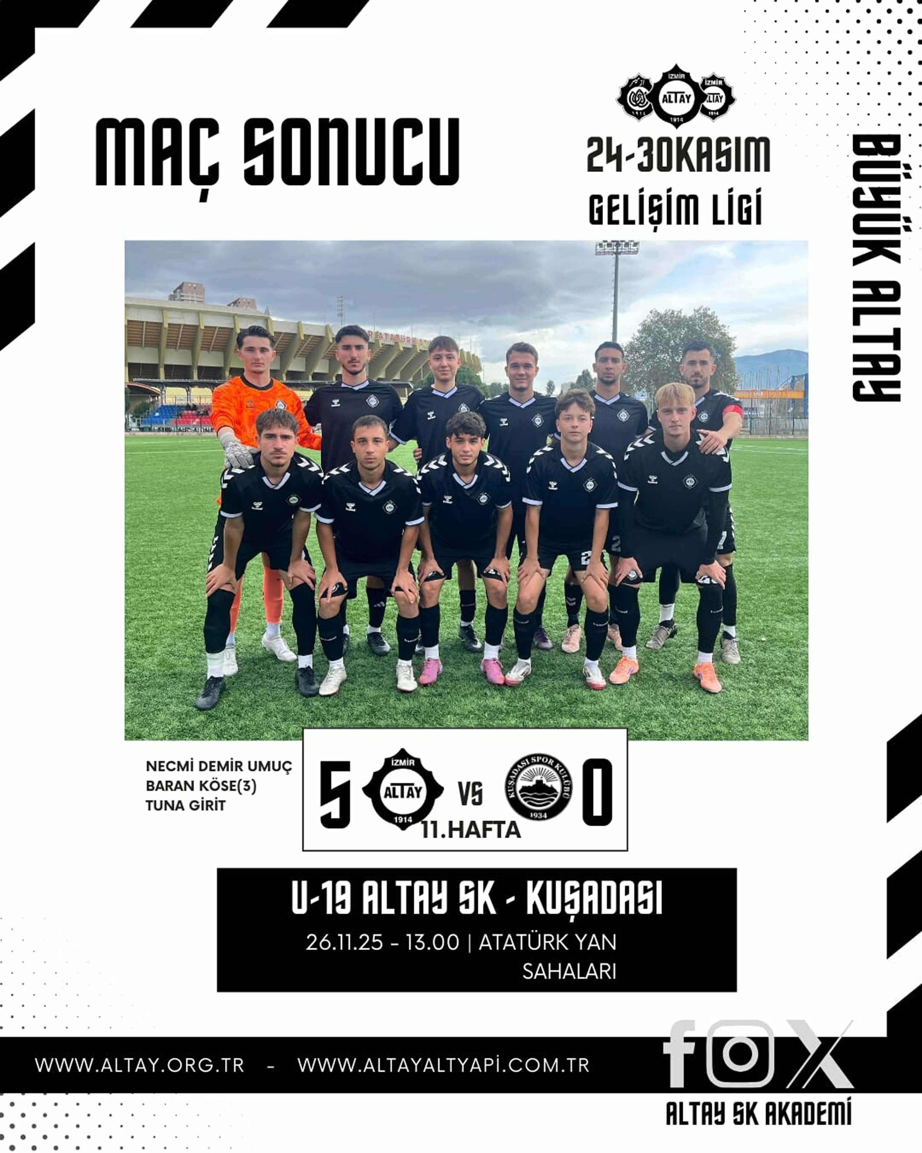 3'üncü Lig 4'üncü Grup'ta deplasmanda Alanya 1221'e 1-0 yenilerek üst üste 3'üncü mağlubiyetini alan ve 6 puanla düşme hattında yer alan Altay; Bölgesel Amatör Lig'e düşme tehlikesi yaşarken, siyah-beyazlıların altyapı takımları geçen hafta Gelişim Ligleri'nde aldıkları sonuçlarla yönetime teselli oldu. A takım kötü gidişe engel olamazken, altyapı 5'te 5 yaptı.