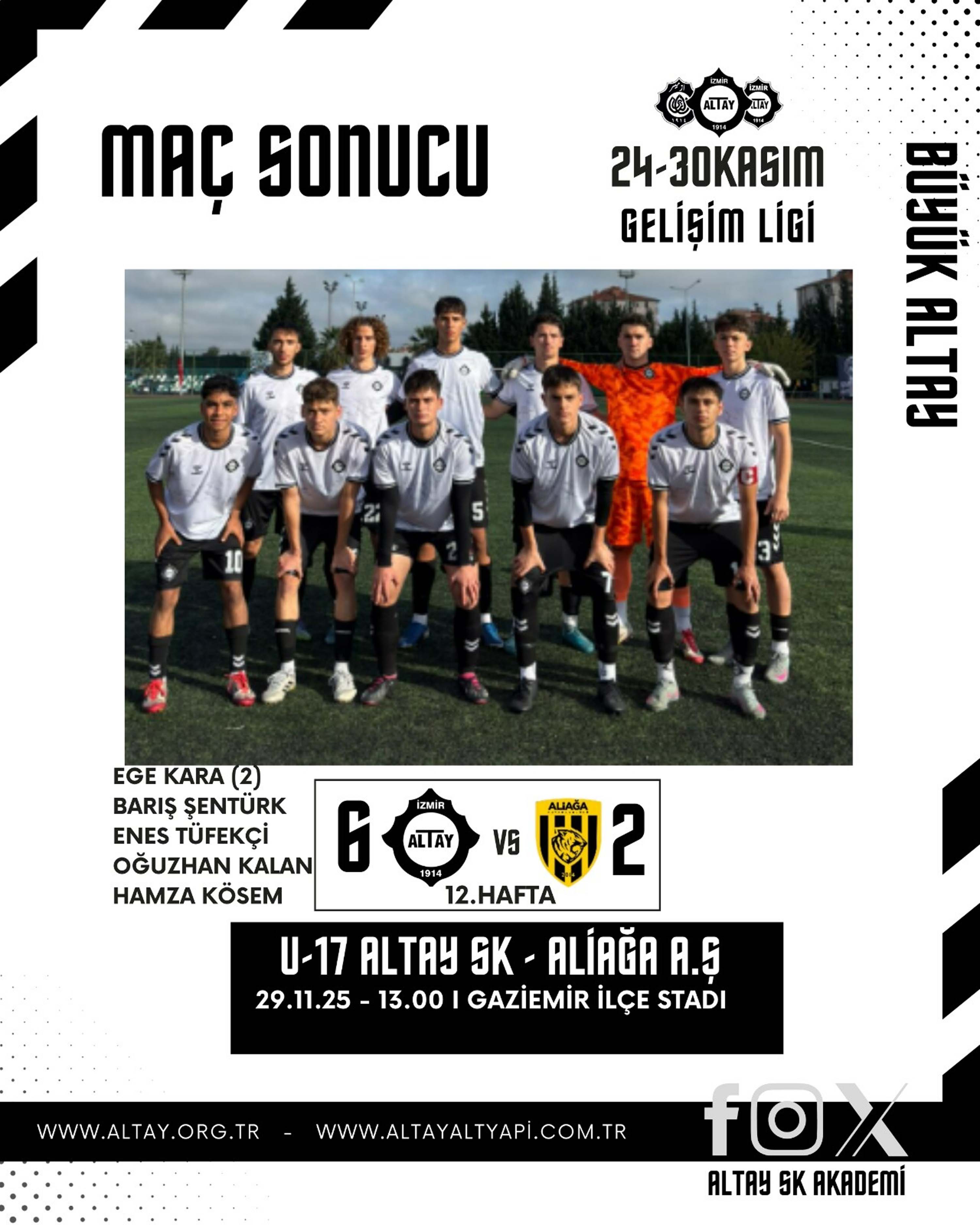 U17 Gelişim Ligi 7'nci Grup'ta Altay, son olarak evinde zirve takipçisi Aliağa Futbol'u 6-2'lik skorla dize getirip 2'nci sıraya yükseldi. U16 Gelişim Ligi 7'nci Grup'ta alt sıralardan uzaklaşma mücadelesi veren İzmir ekibi, son sınavında Aliağa Futbol'u 2-0 yenerek moral buldu. U15 Gelişim Ligi 14'üncü Grup'ta siyah-beyazlılar en son İzmir Çoruhlu FK'yı 4-0 yenip zirve takibini sürdürdü. U14 Gelişim Ligi 14'üncü Grup'ta ise Altay, İzmir Çoruhlu'yu 2-1 mağlup ederek 7'nci sıraya yükseldi. Gençler aldıkları galibiyetlerle kulübe moral verdi. (DHA)