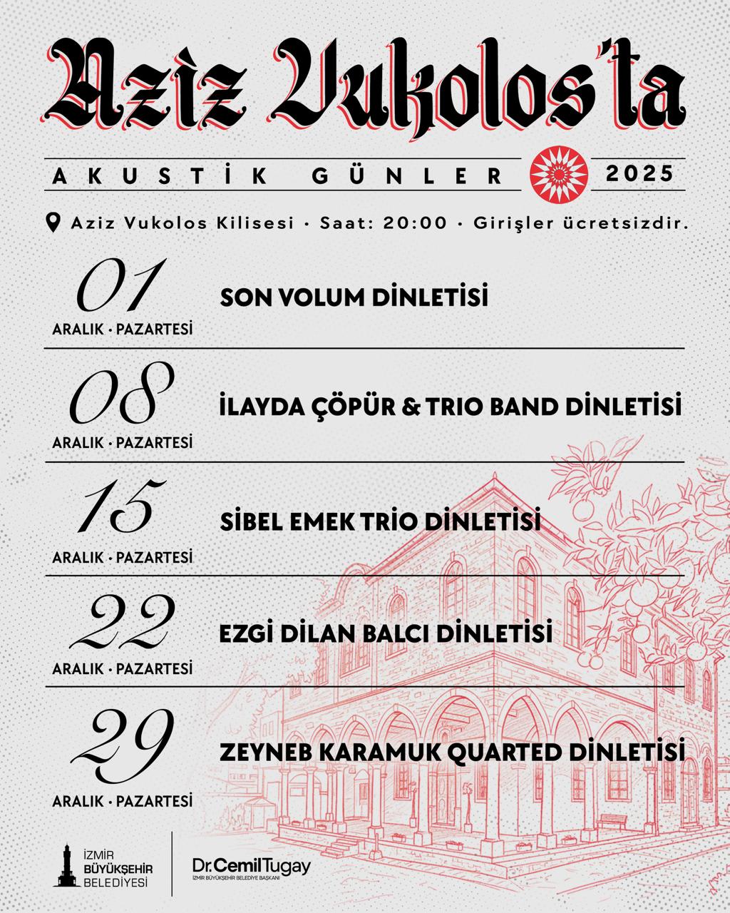 İzmir Büyükşehir Belediyesi Kültür, Sanat ve Sosyal İşler Dairesi Başkanlığı tarafından, kent kültürüne katkı sağlamak ve müzikal çeşitliliği desteklemek amacıyla “Aziz Vukolos’ta Akustik Günler” konser etkinliği düzenlenecek. Etkinlik programında, farklı müzik türlerini bir araya getiren zengin bir repertuvar yer alıyor. Müzik etkinlikleriyle hem yerel hem de evrensel müzik türlerinin bir arada sunulması, kentin kültürel çeşitliliğinin vurgulanması ve sanatseverlerin farklı müzik tarzlarını deneyimleyebilmesi amaçlanıyor.