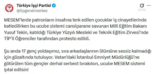Mesleki Eğitim Merkezleri (MESEM) uygulamasına karşı Tekin’i protesto eden öğrencilerden 17 TİP üyesinin gözaltına alındığı bildirilen açıklamada, "MESEM’lerde patronların insafına terk edilen çocuklar iş cinayetlerinde katledilirken bu ucube sistemi cansiparane savunan Milli Eğitim Bakanı Yusuf Tekin, katıldığı Türkiye Yüzyılı Mesleki ve Teknik Eğitim Zirvesi’nde TİP’li Öğrenciler tarafından protesto edildi. Şu anda 17 genç yoldaşımız, sıra arkadaşlarının ölümüne sessiz kalmadığı için gözaltında tutuluyor. Vatan’daki İstanbul Emniyet Müdürlüğü’ne götürülen tüm gençler derhal serbest bırakılsın, ucube MESEM sistemi iptal edilsin” denildi.