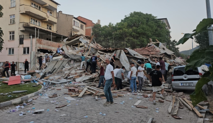 Sındırgı ilçesindeki bir binanın yıkıldığı görüldü.