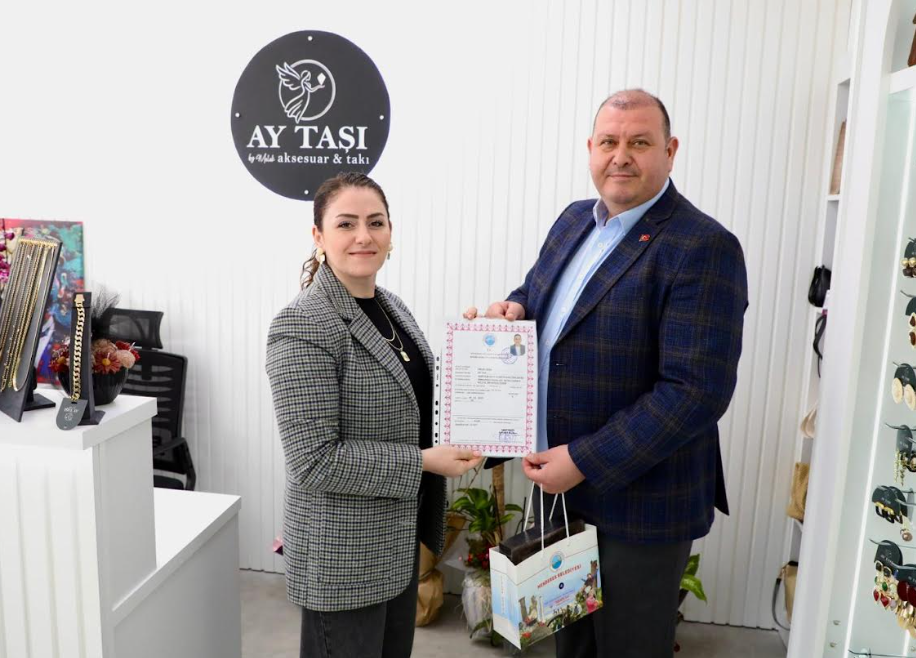 Menderes Belediye Başkanı İlkay Çiçek’in eşi Melek Çiçek’in Menderes’e kazandırdığı Ay Taşı Aksesuar ve Takı işletmesinin ruhsatını Başkan Çiçek kendisi teslim etti. Yapılan sürpriz ziyarette işyeri ruhsatını eşine veren Başkan Çiçek’in sürprizi eşi Melek Çiçek tarafından mutlulukla karşılandı.