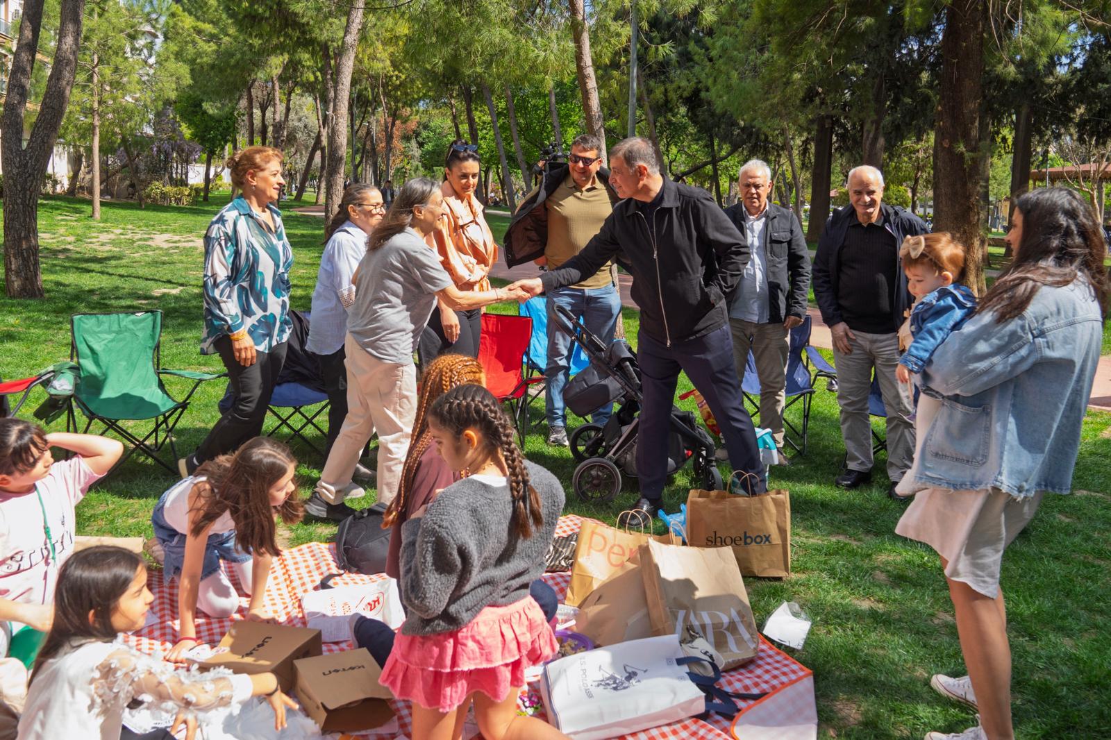 Ziyaret sırasında parkta düzenlenen bir doğum günü kutlamasına denk gelen Başkan Tugay, 10 yaşındaki Karya Göçte ile yeni yaşlarına giren Eylül ve Çınar’ın sevincine ortak olarak çocukların doğum gününü kutladı. Renkli anların yaşandığı parkta çocuklarla yakından ilgilenen Tugay, ailelerle de sohbet etti.