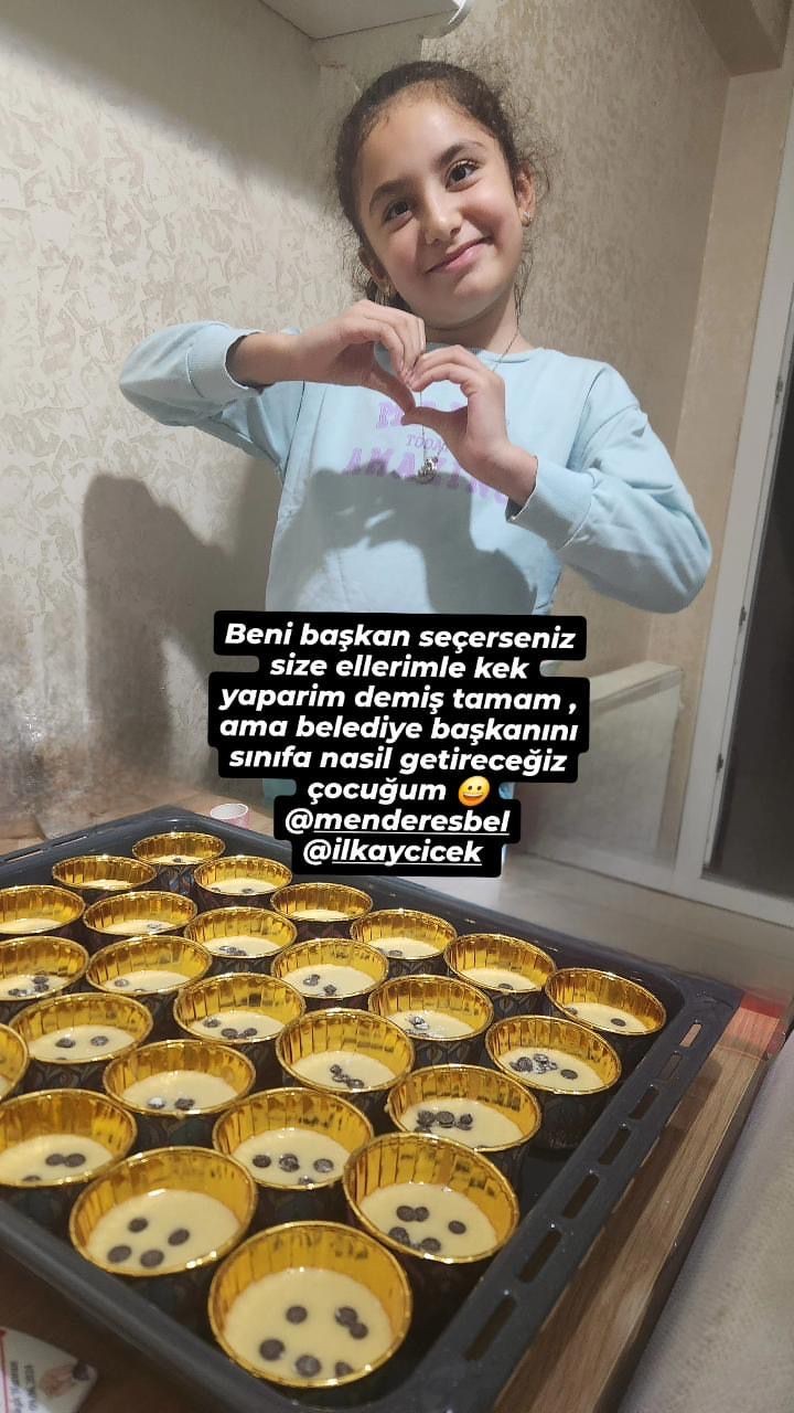 Menderes Maurice Aliberti- Esin Özgener İlkokulu 3/A sınıfında başkanlık seçimlerinde kalpleri ısıtan bir olay gerçekleşti. Sınıf başkanlığı seçimlerinde “kazanırsamsize kek yaparım, sınıfa da Menderes Belediye Başkanı İlkay Çiçek’i getireceğim” diyen Miray Öre sözünü tuttu. Öre’nin vaadini yaptığı kek ile birlikte sosyal medyada paylaşan annesinin paylaşımını fark eden Menderes Belediye Başkanı İlkay Çiçek bu olaya kayıtsız kalmadı.