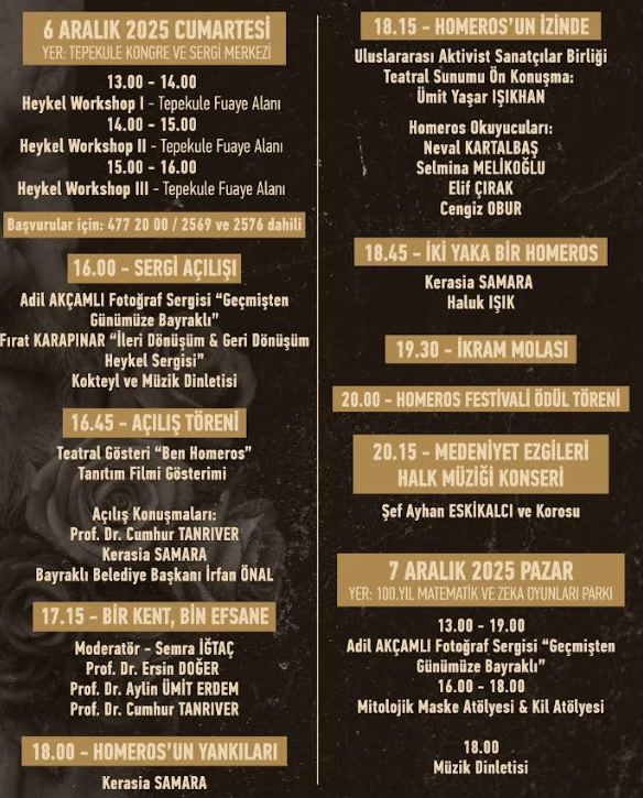 Festival süresince Bayraklı’nın farklı noktalarında; yazar buluşmaları, Homeros okumaları, Smyrna Antik Kenti üzerine sunumlar, akademik paneller ve söyleşiler gerçekleştirilecek. Çocuklar için özel olarak hazırlanan yaratıcı atölyeler, tiyatro ve dans gösterileri, müzik dinletileri ve konserler festival atmosferini zenginleştirecek. Açık hava etkinlikleriyle de kentin sokaklarına kültürel bir hareketlilik yayılacak, Bayraklı’nın tarihsel hafızası sanatın evrensel diliyle yeniden canlanacak.