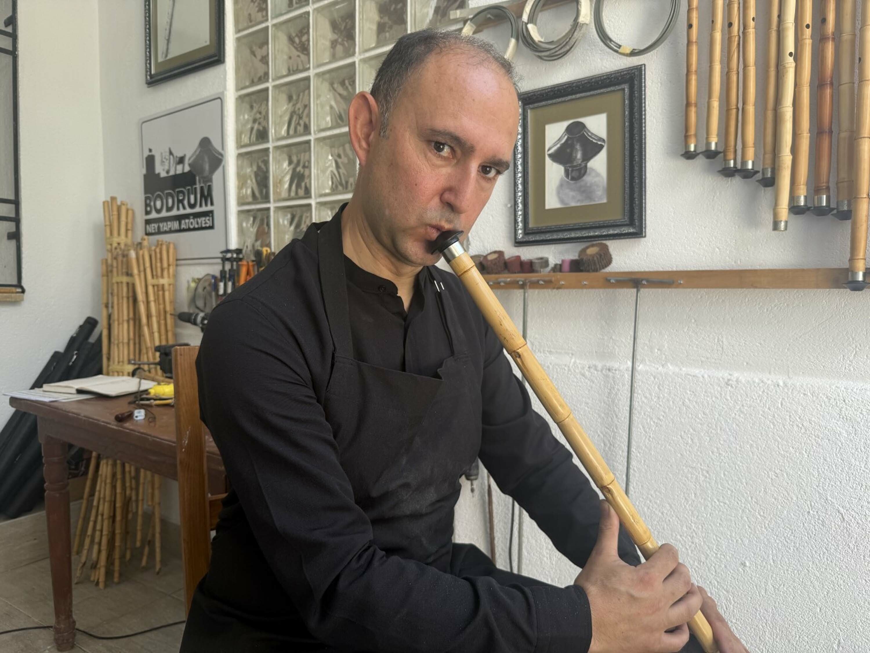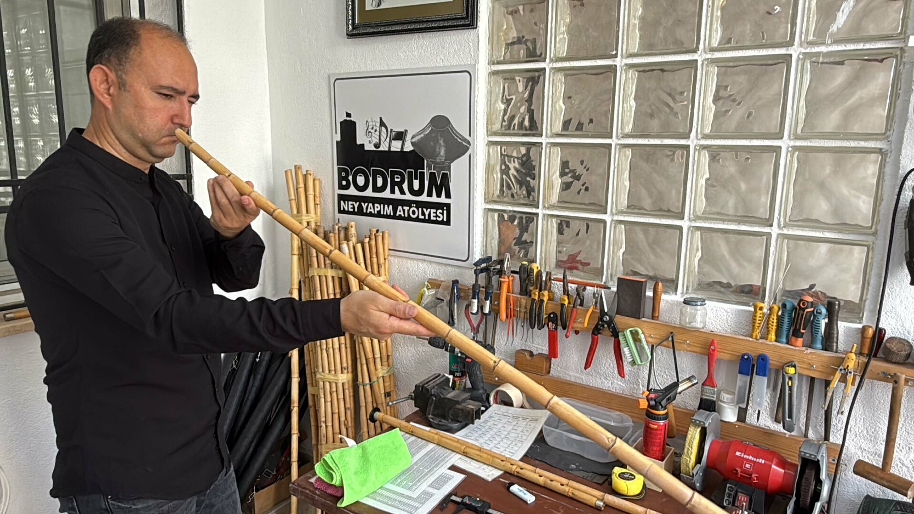 25 yıldır ney üfleyen, evli ve 2 çocuk babası Atatürk İlkokulu Müdürü Eyüp Turan, 15 yıl önce kendi neyini yapma hayaliyle başladığı çalışmaları ilerleterek evinin bahçesine küçük bir atölye kurdu.