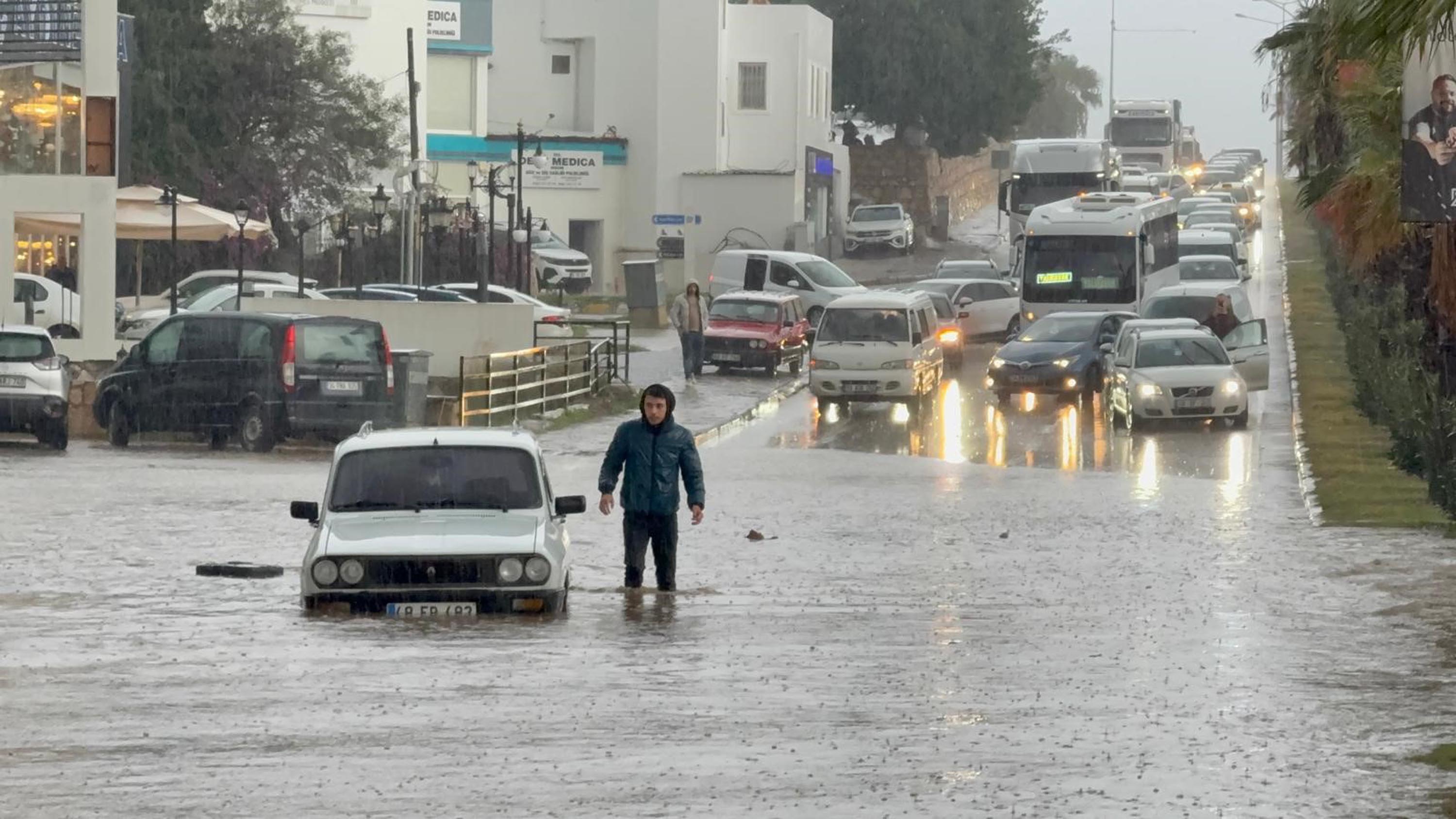 Bodrum-Turgutreis istikameti ve Gümbet istikametinde cadde ve sokaklar göle döndü. Bazı araçlar yolda mahsur kaldı.