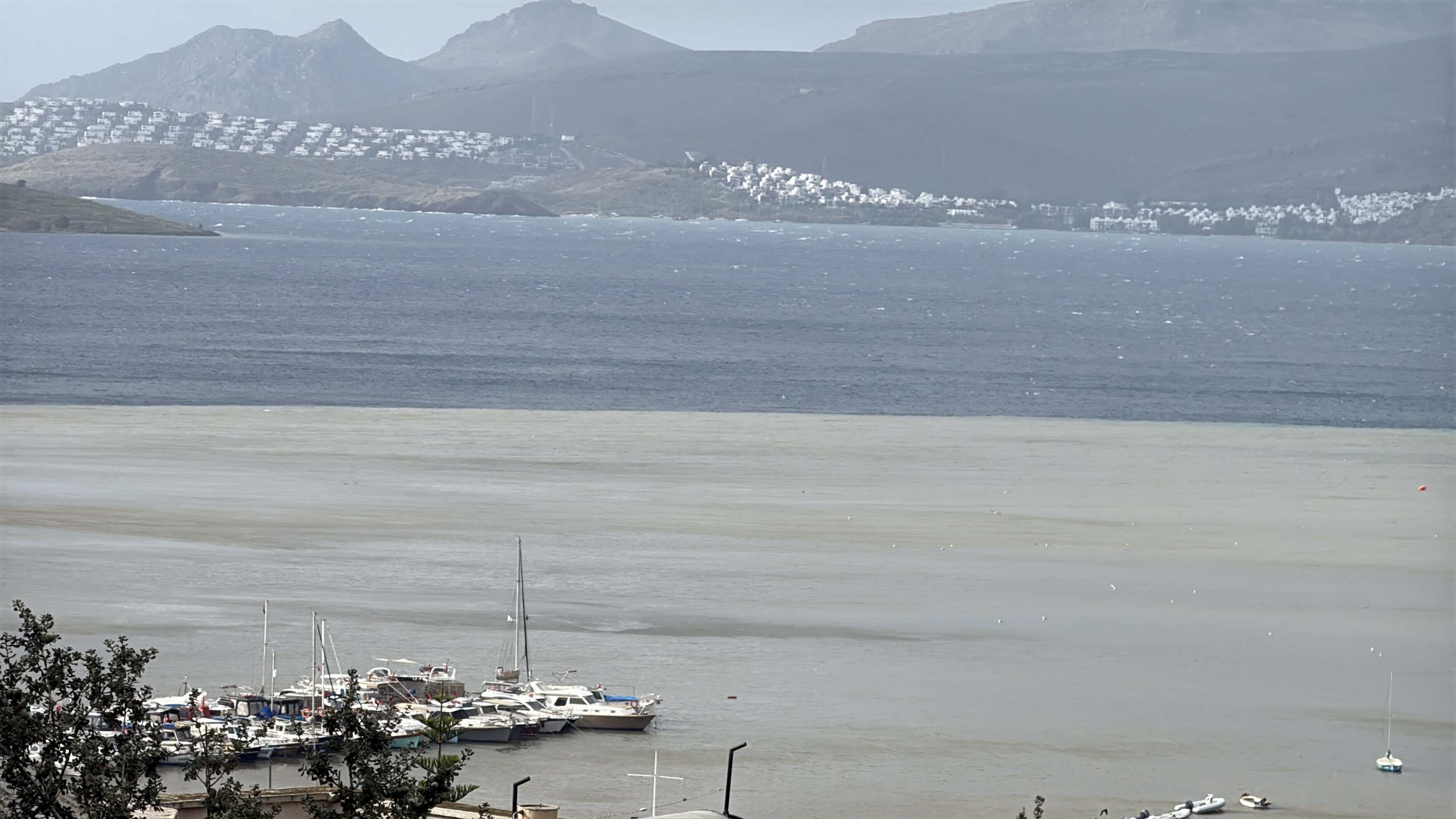 Bodrum'da etkili olan kuvvetli sağanak nedeniyle derelerin debisi yükseldi, denizin rengi kahverengiye döndü.