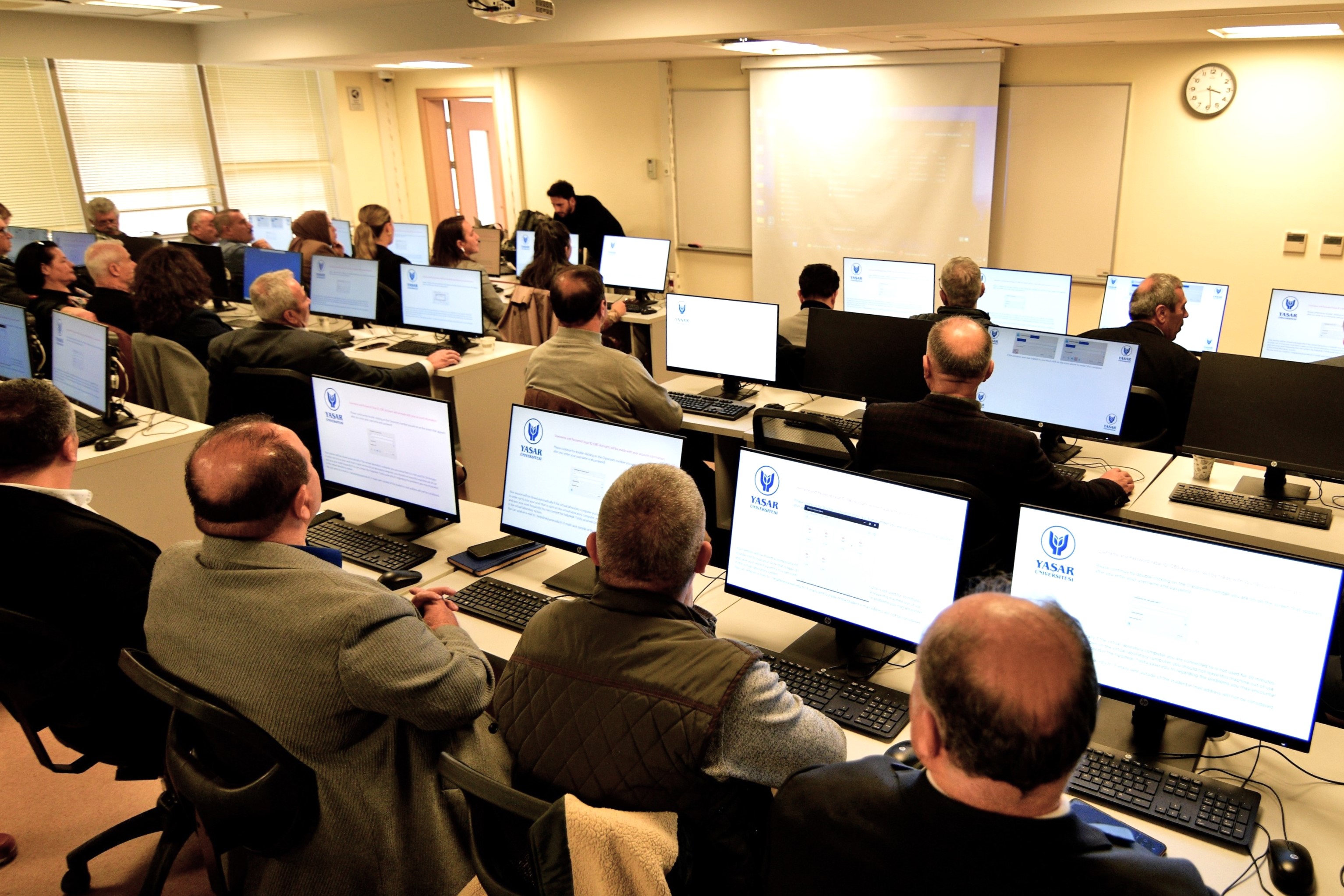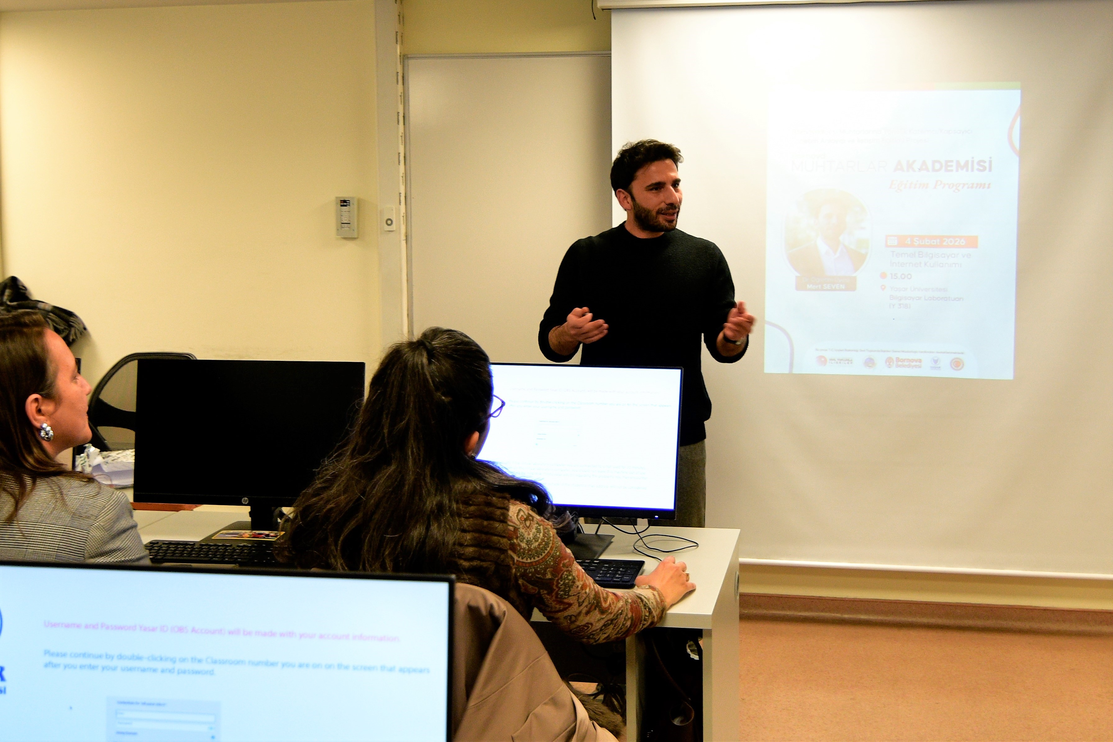 Yaşar Üniversitesi Dr. Öğretim Üyesi Mert Seven tarafından verilen Temel Bilgisayar ve İnternet Kullanımı eğitimi, üniversitenin bilgisayar dersliğinde uygulamalı olarak gerçekleştirildi. Muhtarlar, dijital araçların kamu hizmetlerinde daha etkin kullanımı konusunda bilgi edindi.