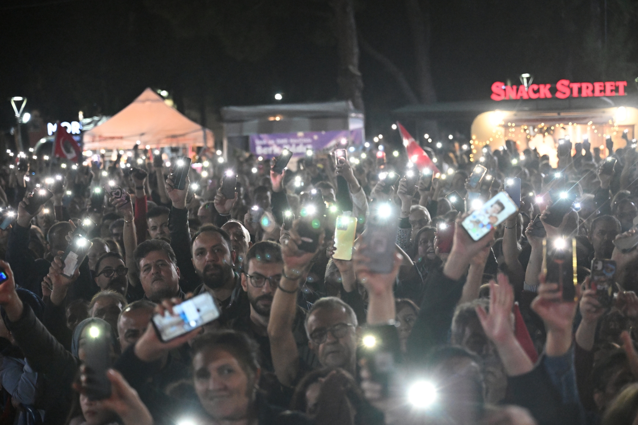 Büyükpark Meydanı’nı dolduran binlerce Bornovalının coşkulu tezahüratları arasında sahneye çıkan Türk Halk Müziği Sanatçısı Sevcan Orhan, sevilen türkülerini hep bir ağızdan söyledi.