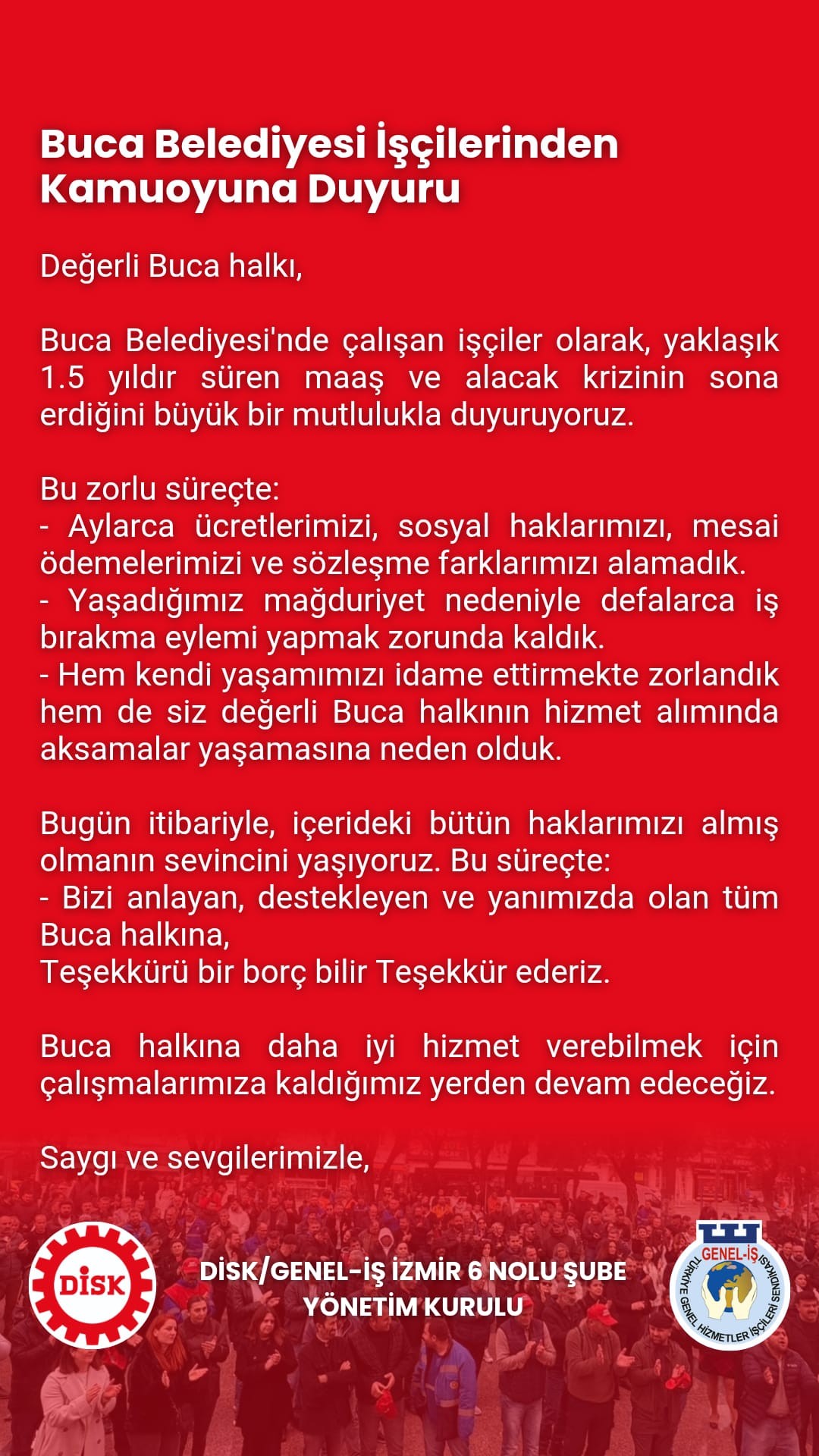 Öte yandan yayımlanan açıklamada, süreç boyunca işçilerin ücretlerini, sosyal haklarını, fazla mesai ödemelerini ve sözleşmeden kaynaklanan alacaklarını uzun süre tahsil edemediği belirtildi. Yaşanan mağduriyet nedeniyle defalarca iş bırakma eylemi yapmak zorunda kaldıklarını ifade eden işçiler, hem kendi yaşamlarını sürdürmekte zorlandıklarını hem de Buca halkının belediye hizmetlerinden yararlanmasında aksamalar yaşandığını vurguladı.