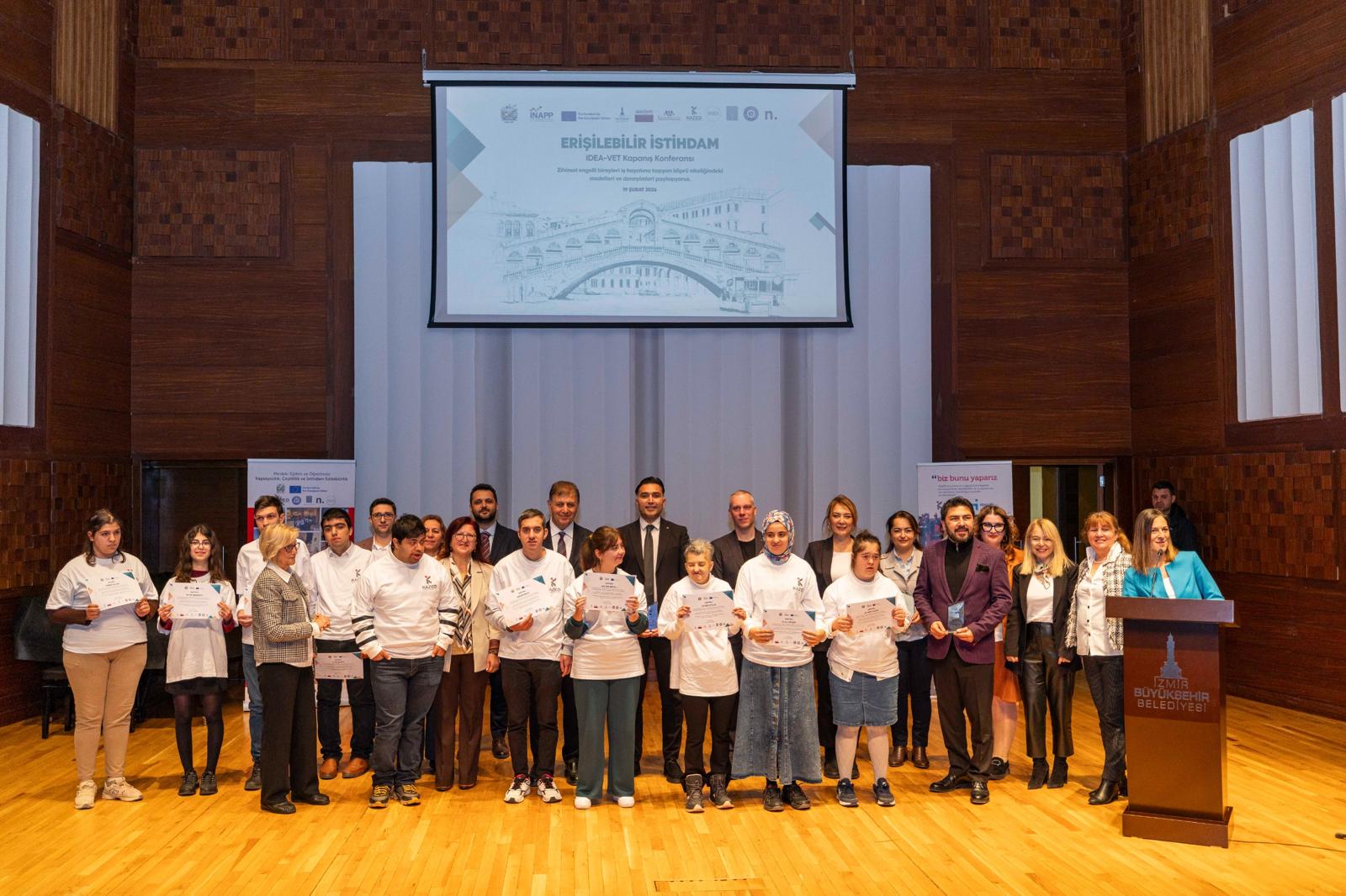 İtalya Ulusal Ajansı tarafından kabul edilerek, zihinsel engelli bireylerin sosyal hayata ve iş hayatına hazırlanması için geliştirilen ve Mutfak Becerileri Modülü’nü temel alan IDEA-VET Erasmus + projesinin “Erişilebilir İstihdam” adlı kapanış konferansı Ahmed Adnan Saygun Sanat Merkezi Küçük Salon'da yapıldı. İzmir Büyükşehir Belediye Başkanı Dr. Cemil Tugay’ın Karşıyaka Belediye Başkanlığı döneminde sunduğu destek mektubu ile hayat bulan IDEA-VET projesi, İzmir Büyükşehir Belediyesi Sosyal Hizmetler Dairesi Başkanlığı Engelli Çalışmaları Şube Müdürlüğü Destekli İstihdam Ofisi ile kurumsal bir yapıya dönüştü. Projenin Türkiye ayağında Karşıyaka Akademi Zihinsel Engelliler Derneği (KAZED) ve Ege Üniversitesi yer aldı. Zihinsel engelli bireylerin üretim süreçlerine katılımlarını güçlendiren, onları iş yaşamının aktif ve görünür bir parçası haline getirmeyi hedefleyen projenin kapanış konferansına İzmir Büyükşehir Belediye Başkanı Dr. Cemil Tugay, KAZED Başkanı Tülin Topuzoğlu, IDEA-VET Proje Koordinatörü Giuseppe Scarabello, Ege Üniversitesi Hemşirelik Fakültesi Dekan Vekili Prof. Dr. Fatma Orgun ve projedeki zihinsel engelli bireyler ile aileleri katıldı. Konferansta mutfak eğitimlerini tamamlayan 10 genç sertifikalarını aldı. Destekli İstihdam Ofisi tarafından geliştirilen “Mutfak Becerileri Modülü”, Meslek Fabrikası aracılığıyla kalıcı ve uygulanabilir bir yapıya dönüştürülecek.