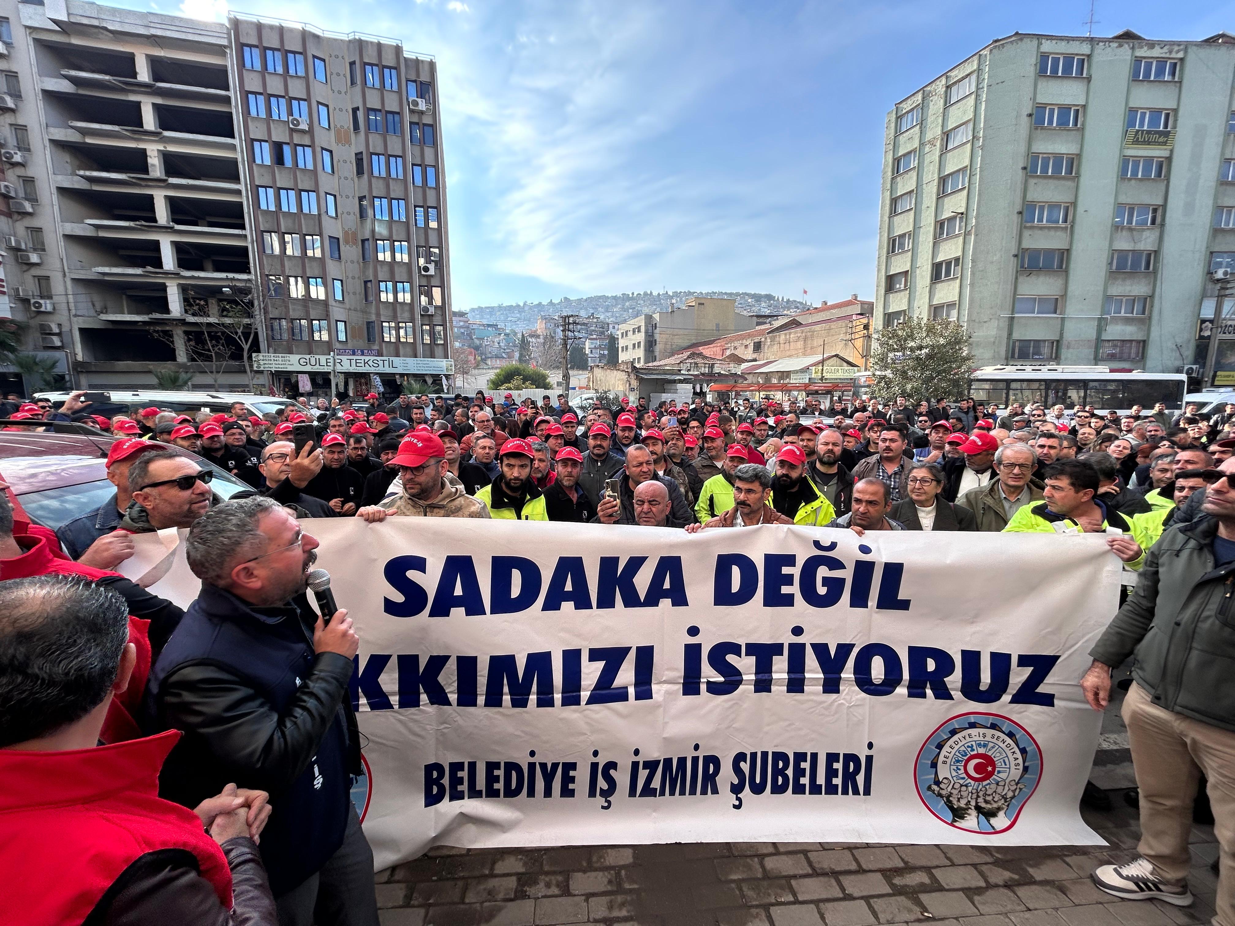 İşçiler adına basın açıklamasını okuyan Belediye İş Sendikası İzmir 2 No'lu Şube Başkanı Savaş Atalay, "İzmir Büyükşehir Belediyesi yönetimi, Kasım ayı işçi maaşlarını eksik ödemiştir. Oysa bir işverenin emekçilerine karşı en temel görevi; ücretlerini tam ve zamanında ödemektir. Bu, sadece hukuki bir yükümlülük değil; aynı zamanda ahlaki, vicdani ve insani bir zorunluluktur. Bu kentin her gününü emeğiyle var eden, İzmir’i yaşanabilir bir şehir yapan, gece her şeye rağmen her anı olsun aksatmayalım belediye emekçileridir. Bu emekçilerin tek gelir kaynağı ise alın terlerinin karşılığı olan maaşlarıdır. Bu nedenle Kasım maaşının eksik ödenmesi işçiyi ve ailesini açlığa, borca, yoksulluğa ve çaresizliğe itmek demektir” ifadelerini kullandı.