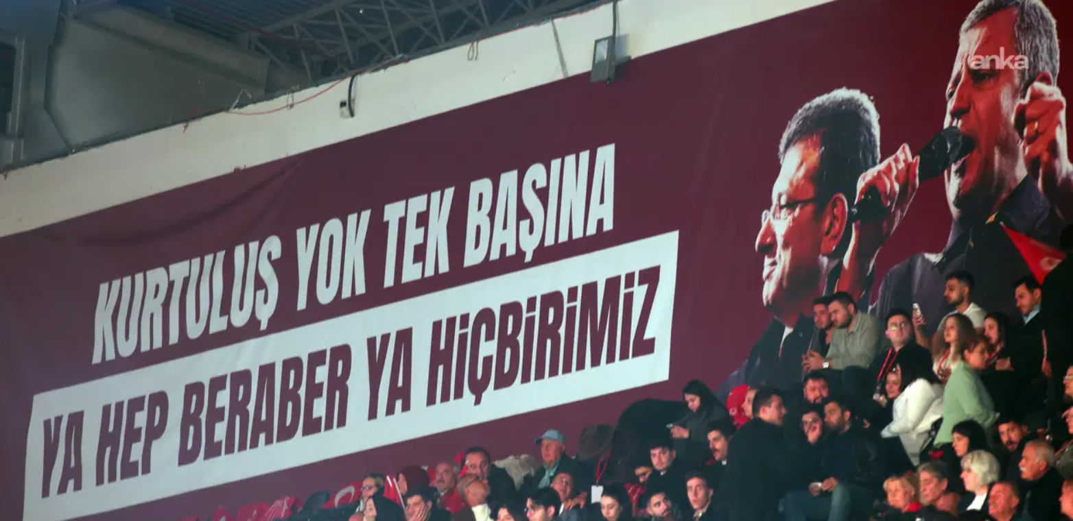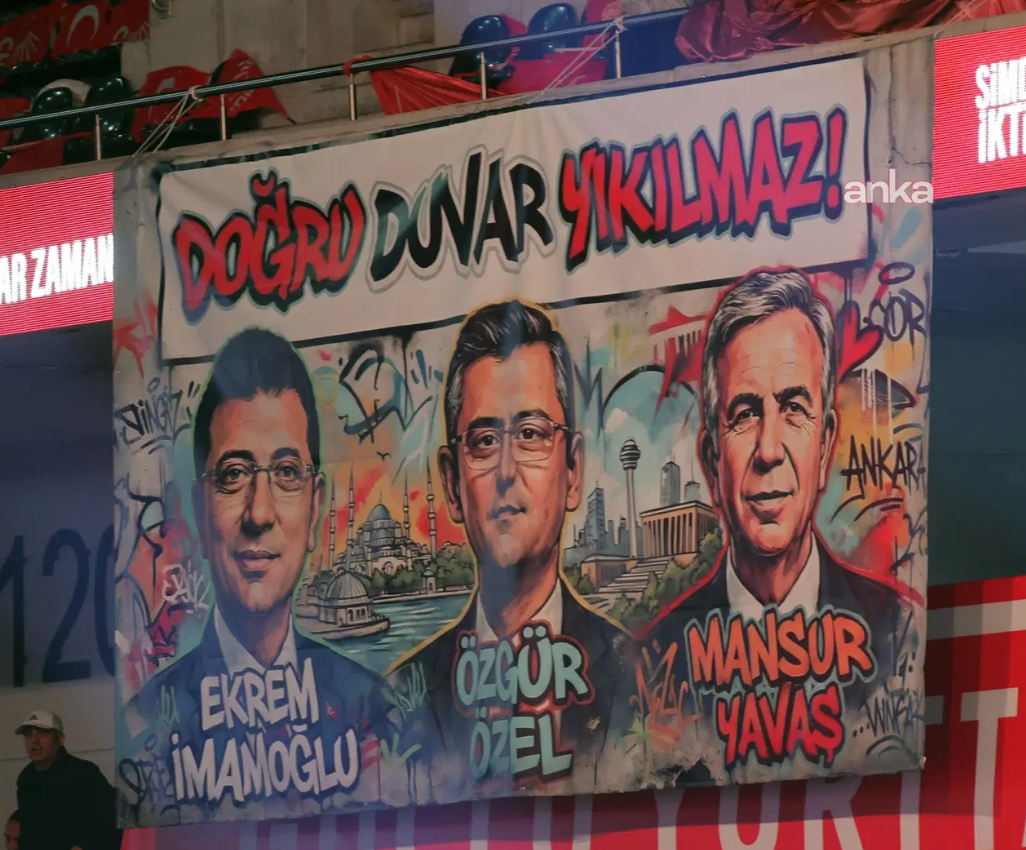 CHP’nin "Şimdi İktidar Zamanı" Kurultayı’nda, Özgür Özel, Ekrem İmamoğlu ve Mansur Yavaş'ın resimlerinin olduğu “Doğru duvar yıkılmaz” pankartı asıldı.