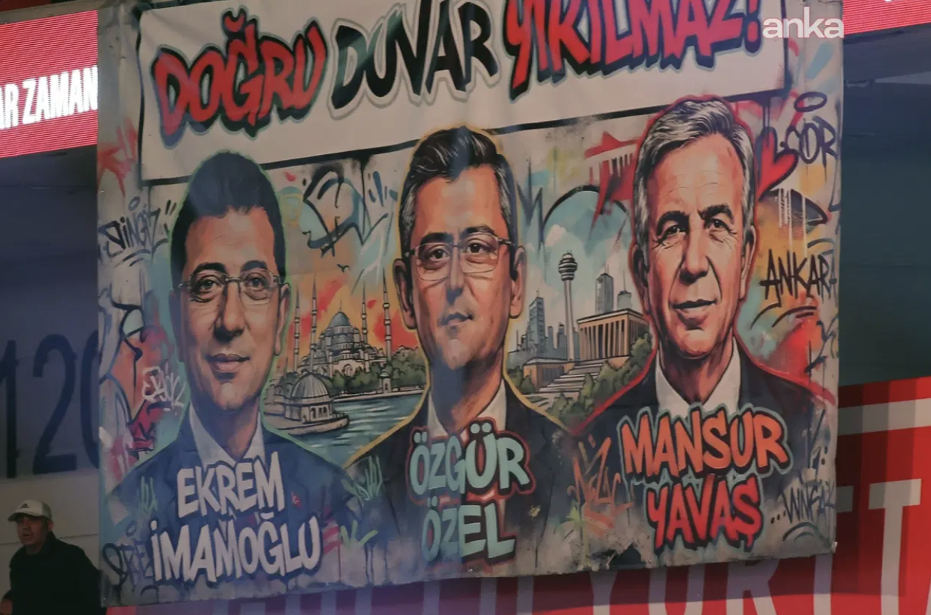 CHP’nin "Şimdi İktidar Zamanı" Kurultayı’nda, Özgür Özel, Ekrem İmamoğlu ve Mansur Yavaş'ın resimlerinin olduğu “Doğru duvar yıkılmaz” pankartı asıldı.