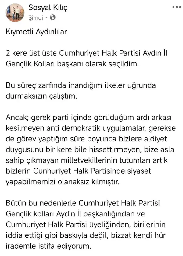 Sosyal Kılıç, sosyal medya hesabından yaptığı açıklamada, "2 kere üst üste Cumhuriyet Halk Partisi Aydın İl Gençlik Kolları Başkanı olarak seçildim. Bu süre zarfında inandığım ilkeler uğrunda durmaksızın çalıştım. Ancak gerek parti içinde gördüğüm ardı arkası kesilmeyen antidemokratik uygulamalar, gerekse de görev yaptığım süre boyunca bizlere aidiyet duygusunu bir kere bile hissettirmeyen, bize asla sahip çıkmayan milletvekillerinin tutumları artık bizlerin Cumhuriyet Halk Partisi'nde siyaset yapabilmemizi olanaksız kılmıştır. Bütün bu nedenlerle Cumhuriyet Halk Partisi Gençlik Kolları Aydın İl başkanlığından ve Cumhuriyet Halk Partisi üyeliğinden, birilerinin iddia ettiği gibi baskıyla değil, bizzat kendi hür irademle istifa ediyorum" dedi.