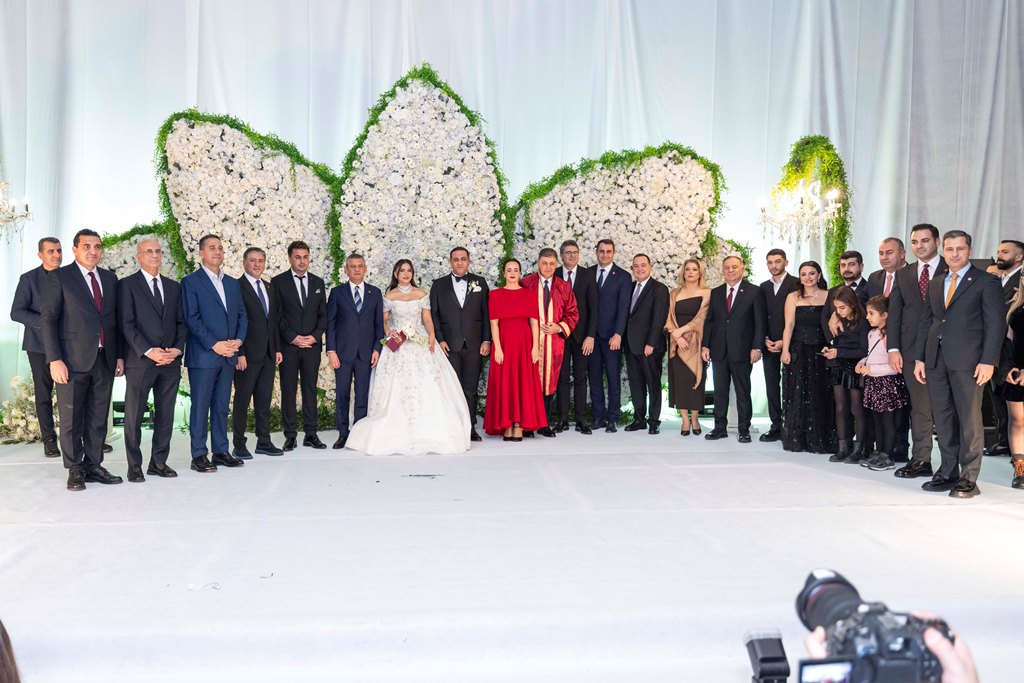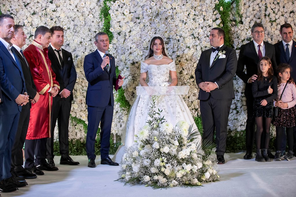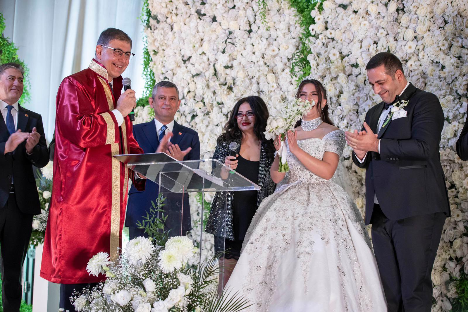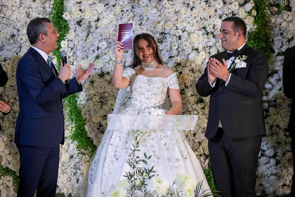 Siyaset, iş, sanat ve spor dünyasından birçok ismin katıldığı törende, CHP Genel Başkanı Özgür Özel çifte mutluluklar dileyerek evlilik cüzdanını teslim etti.