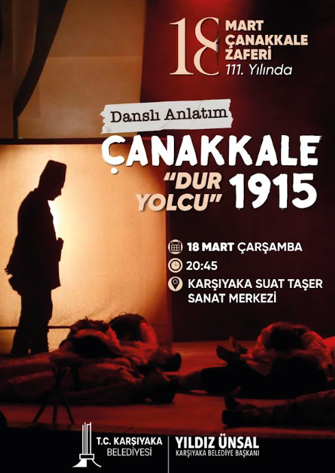 Karşıyaka Belediyesi, 18 Mart Çanakkale Zaferi’nin yıl dönümünü duygusal bir etkinlikle kutlayacak. Karşıyaka Belediyesi Halk Dansları Topluluğu’nun sergileyeceği “Çanakkale 1915 DUR YOLCU!” adlı müzikal gösteri, 18 Mart Çarşamba günü saat 20.45’te Karşıyaka Suat Taşer Sanat Merkezi’nde izleyicilerle buluşacak. Genel Sanat Yönetmenliğini Burak Elibüyük ve Alper Özarslan’ın üstlendiği gösteride 120 dansçı görev alacak. Türk milletinin kaderini değiştiren Çanakkale Destanı; müzik, tiyatro ve dansın birleştiği duygu dolu bir performansla sahneye taşınacak.