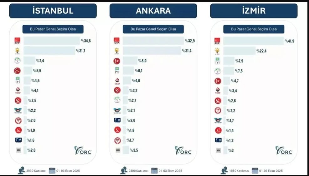 CHP yüzde 41,9 ile açık ara önde yer alırken, AKP yüzde 22,4’te kaldı. İYİ Parti yüzde 7,9, DEM Parti yüzde 7,5, MHP yüzde 4,7 ve Zafer Partisi yüzde 3,4 oranında oy aldı.
