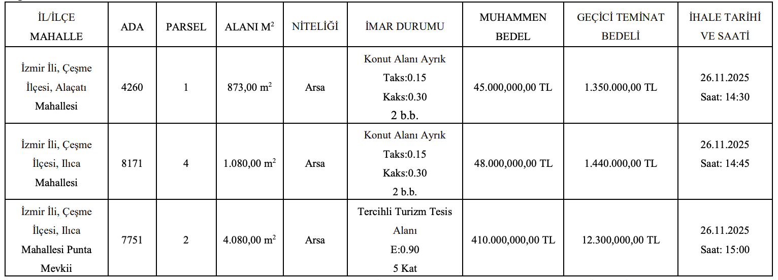 Türkiye’nin en turistik ilçelerinden biri olan Çeşme’nin Alaçatı Mahallesi’nde 1 ve Ilıca Mahallesi’nde 2 arsa niteliğindeki taşınmaz satışa çıkarıldı.