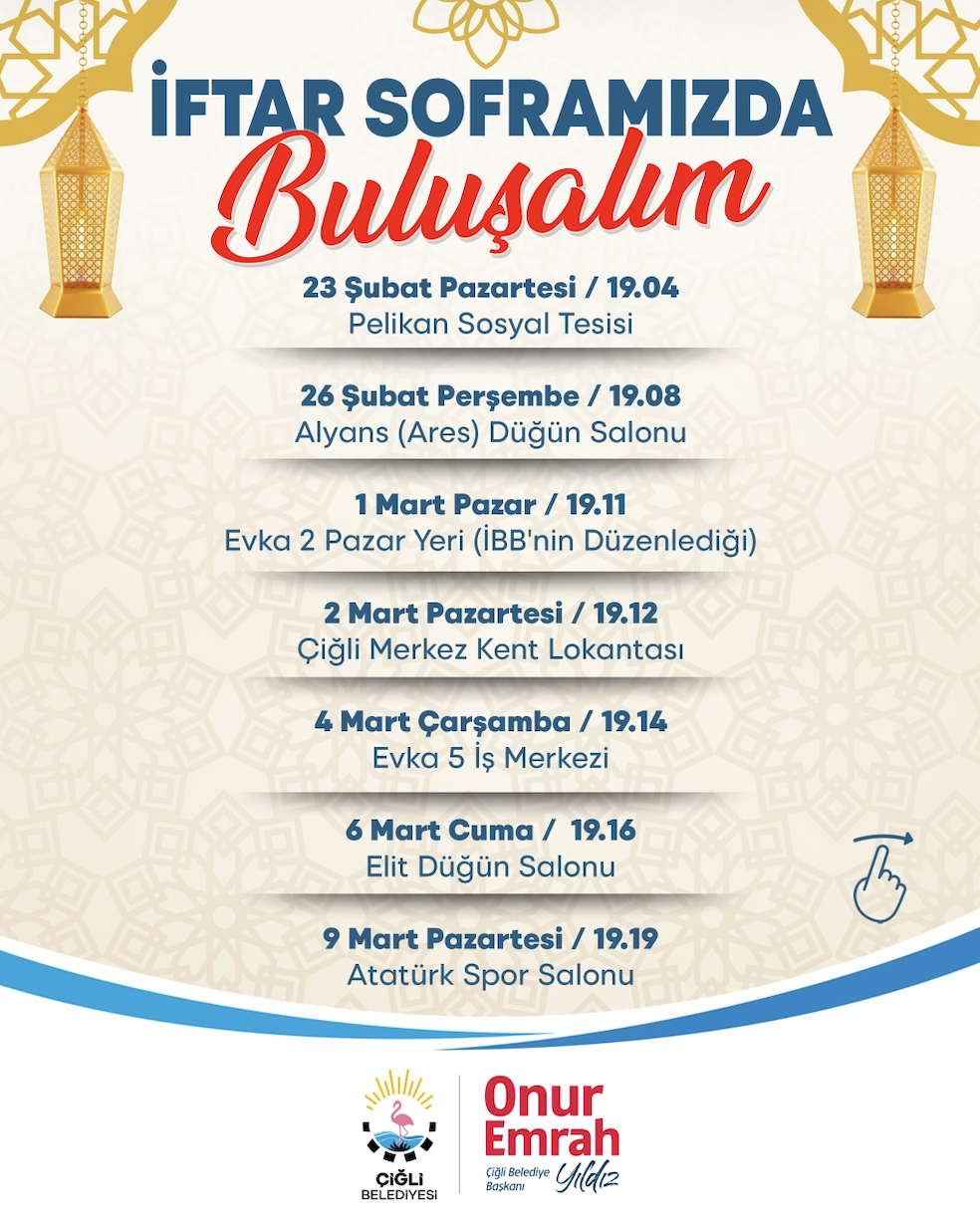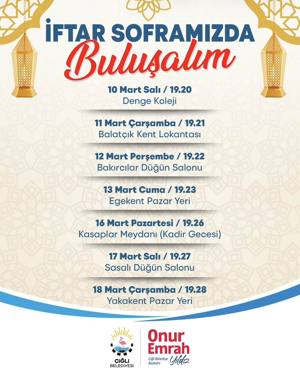 İftarlar, 23 Şubat Pazartesi günü Pelikan Sosyal Tesisi’nde başlayacak. Ardından 26 Şubat Perşembe günü Alyans (Ares) Düğün Salonu’nda devam edecek buluşmalar; 1 Mart Pazar günü Evka 2 Pazar Yeri’nde, 2 Mart Pazartesi günü Çiğli Merkez Kent Lokantası’nda ve 4 Mart Çarşamba günü Evka 5 İş Merkezi’nde gerçekleştirilecek. İftar sofraları 6 Mart Cuma günü Elit Düğün Salonu’nda, 9 Mart Pazartesi günü Atatürk Spor Salonu’nda, 10 Mart Salı günü Denge Koleji’nde, 11 Mart Çarşamba günü Balatçık Kent Lokantası’nda, 12 Mart Perşembe günü Bakırcılar Düğün Salonu’nda ve 13 Mart Cuma günü Egekent Pazar Yeri’nde kurulacak. Program, 16 Mart Pazartesi günü Kasaplar Meydanı’nda Kadir Gecesi özel iftar programıyla devam edecek; 17 Mart Salı günü Sasallı Düğün Salonu ve 18 Mart Çarşamba günü Yakakent Pazar Yeri’nde düzenlenecek iftarlarla tamamlanacak.