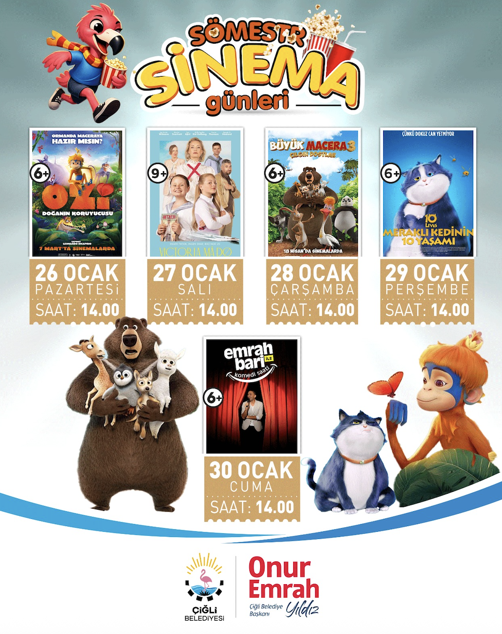 Çocuklara yönelik sosyal ve kültürel etkinliklere büyük önem verdiklerini vurgulayan Çiğli Belediye Başkanı Onur Emrah Yıldız, “Yarıyıl tatili, çocuklarımızın hem dinlenmesi hem de keyifli anılar biriktirmesi için çok özel bir dönem. Çiğli Belediyesi olarak, çocuklarımızın yüzünü güldüren, onların hayal dünyasını zenginleştiren etkinlikleri çok önemsiyoruz. Sömestr Sinema Günleri ile miniklerimizi eğlenceyle, sanatla ve sinemanın büyülü dünyasıyla buluşturuyoruz. Tüm çocuklarımızı aileleriyle birlikte bu güzel etkinliğe davet ediyorum” dedi.
