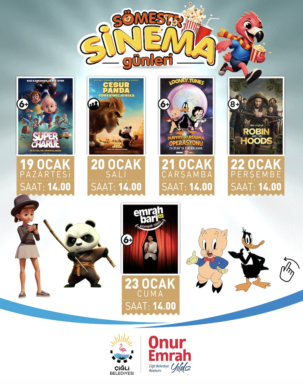 Sinema programı dopdolu içeriğiyle dikkat çekiyor. 19 Ocak Pazartesi günü Süper Charlie filmiyle perde açılırken, 20 Ocak Salı Cesur Panda: Görevimiz Afrika, 21 Ocak Çarşamba Looney Tunes: Dünyayı Kurtarma Operasyonu, 22 Ocak Perşembe Robin and the Hoods ve 23 Ocak Cuma günü ise Emrah Bari’nin çocuklara özel hazırladığı eğlenceli yarışma ve gösteriler miniklerle buluşacak. Etkinliklerde çocuklar sürpriz hediyeler kazanma şansı da yakalayacak. Sömestr Sinema Günleri, 26 Ocak Pazartesi günü Ozi: Doğanın Koruyucusu filmiyle devam edecek. 27 Ocak Salı Victoria Must Go, 28 Ocak Çarşamba Büyük Macera 3: Çılgın Dostlar ve 29 Ocak Perşembe günü Meraklı Kedinin 10 Yaşamı filmleriyle sinema keyfi sürecek. Etkinlikler, 30 Ocak Cuma günü Emrah Bari’nin katılımıyla gerçekleştirilecek çekilişler ve sürpriz eğlencelerle coşkulu bir final yapacak.