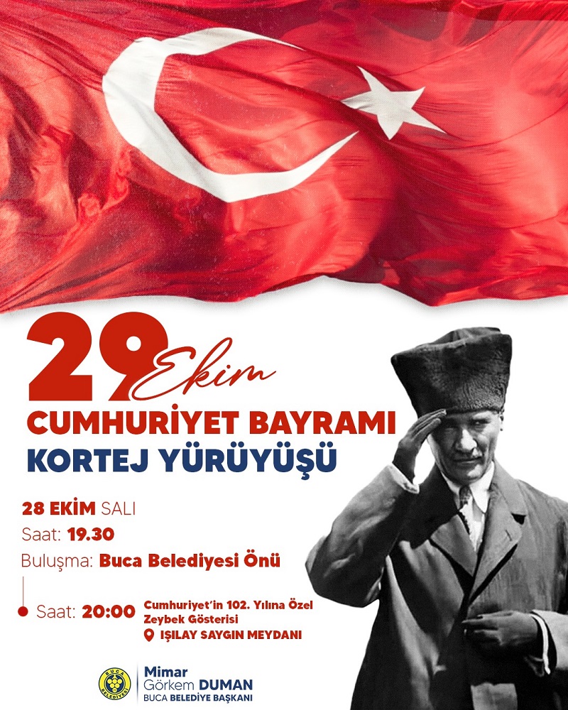 Buca Belediyesi, Cumhuriyet’in 102. yıl dönümü nedeni ile gurur dolu bir kutlama programı hazırladı. Etkinlikler 28 Ekim akşamı saat 19.30’da Buca Belediyesi ana hizmet binası önünden Işılay Saygın Meydanı’na gerçekleştirilecek kortej yürüyüşü ile başlayacak. Türk bayrakları ve meşaleler eşliğinde gerçekleştirilecek bu yürüyüş bayram coşkusunu tüm Buca’ya yayacak. Akşamın doruk noktası ise kahramanlığın ve cesaretin simgesi zeybek gösterisi ile yaşanacak. Saat 20.00’de Işılay Saygın Meydanı’nda gerçekleştirilecek “Cumhuriyet’in 102.Yılına Özel Zeybek Gösterisi”, Ege’nin yiğit ruhunu tüm meydana yayacak.