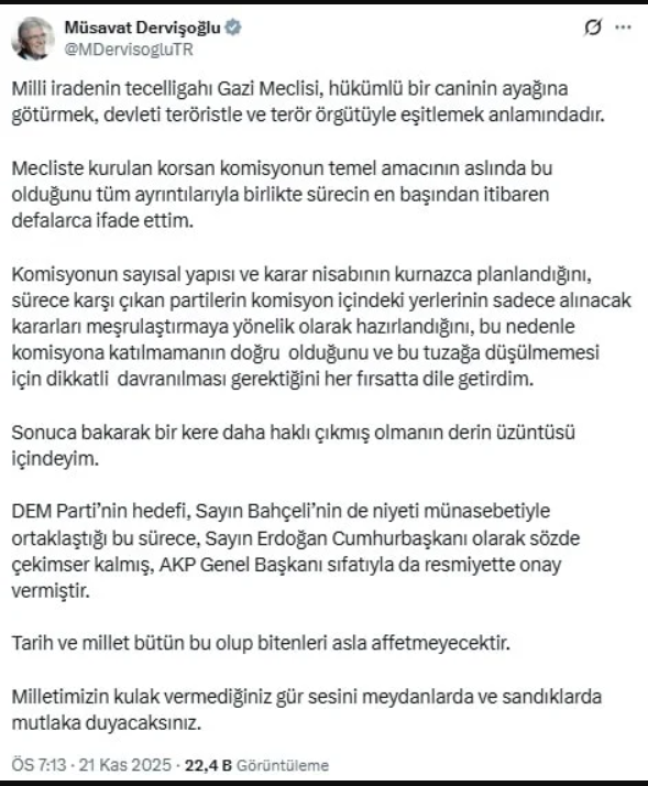 İYİ Parti lideri Müsavat Dervişoğlu sosyal medya hesabından tepki gösteren bir paylaşımda bulundu. Dervişoğlu'nun paylaşımında şu ifadeler yer aldı: