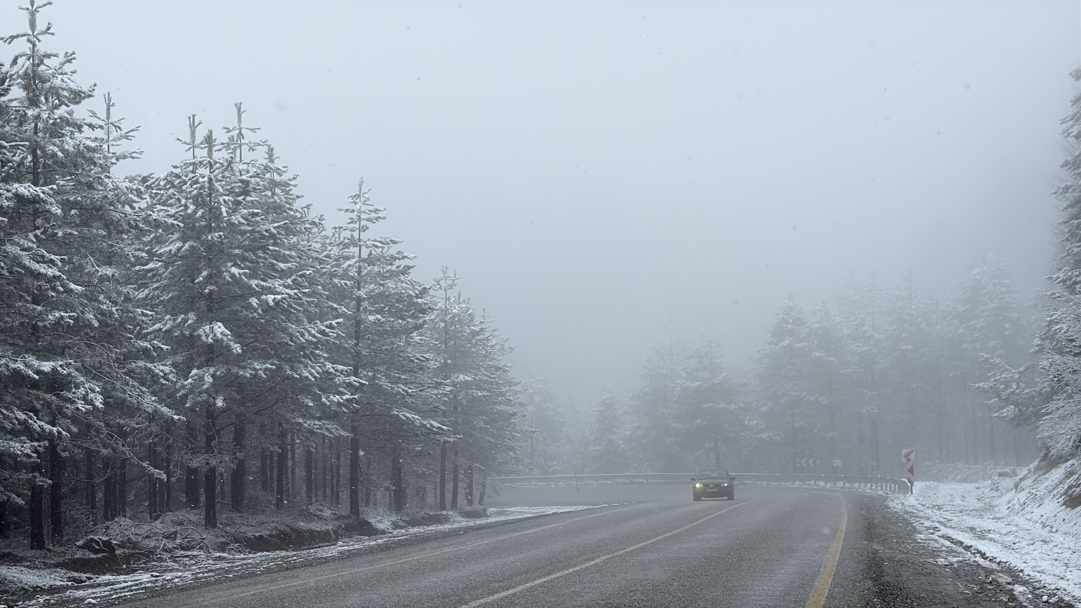 Yağışla birlikte yol kenarları beyaza bürünürken, bölgede etkili olan sis nedeniyle görüş mesafesi zaman zaman düştü.