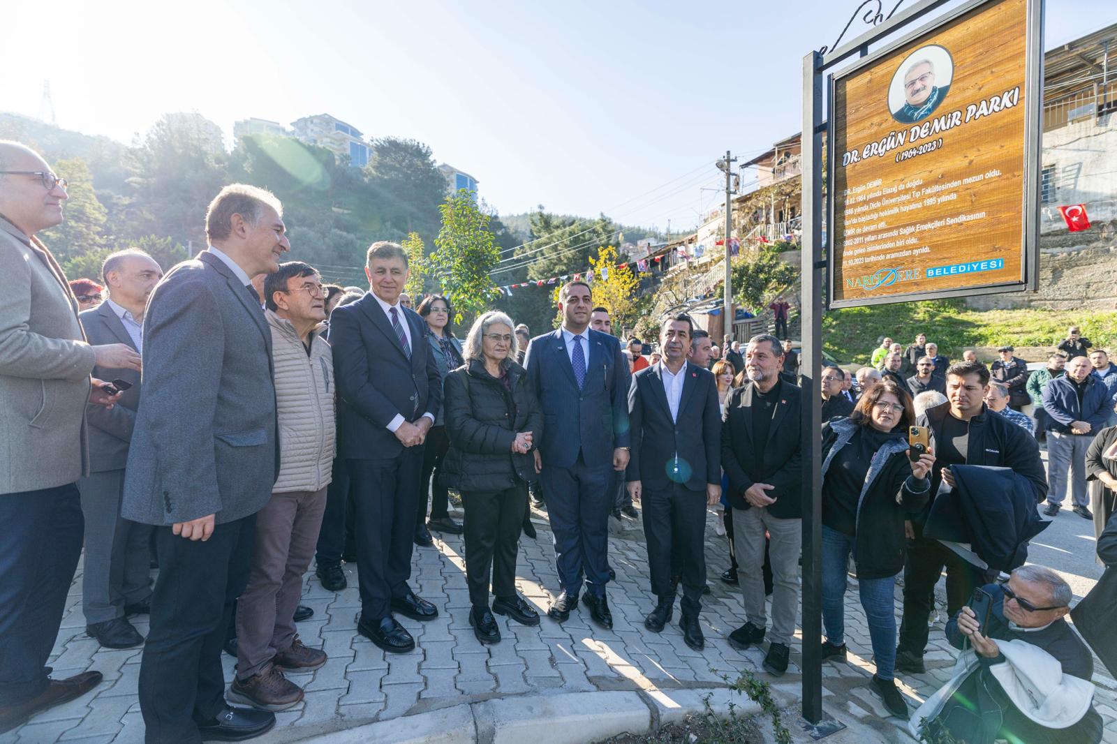 Parkın açılış töreninde konuşan İzmir Büyükşehir Belediye Başkanı Dr. Cemil Tugay, Ergün Demir’i yakından tanıdığını belirterek, “Ergün Demir, zaman zaman yanında, zaman zaman arkasında yürüdüğümüz hepimizin kıymetlisi bir hekim ve büyük bir mücadele insanıydı. Onu tanımak, onunla aynı dönemde yaşamış olmak, mücadelede beraber yer almış olmak bir onur. Onun adına bir park yapmamız hekim camiası için çok kıymetli. Buradaki hekim arkadaşlarımız, ona duydukları sevgi ve saygı ile burada yer alıyor. Hekimlik, zor bir meslek ve cefakârca yapılan bir iş. Bir hekimin yüreğinde ve aklında taşıdığı sorumluluğu, o sorumluluğun ağırlığını bilmek için hekim olmak lazım. Bunu başka türlü anlamanın yolu yok” diye konuştu.