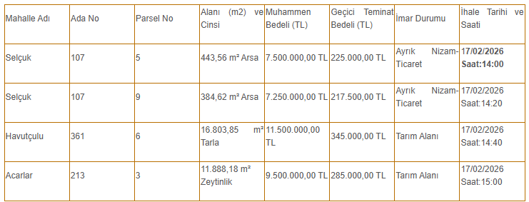 İlan.gov.tr’de yayımlanan duyuruya göre; biri tarla, biri zeytinlik, ikisi arsa olmak üzere toplam 4 taşınmaz için ihale düzenlenecek. Satışa konu taşınmazlar ilçenin Selçuk, Havutçulu ve Acarlar mahallelerinde yer alıyor.
