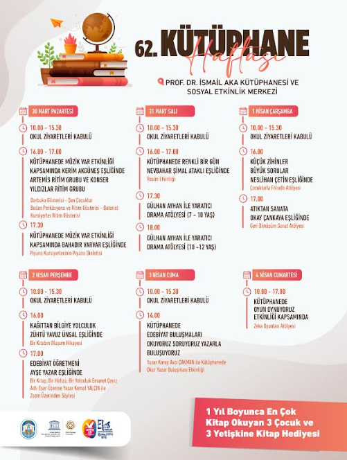 Hafta boyunca her gün 10.00 – 15.30 saatleri arasında okulların kütüphane ziyaretleri kabul edilirken, etkinlik programı farklı yaş gruplarına yönelik atölye ve söyleşilerle zenginleşecek.