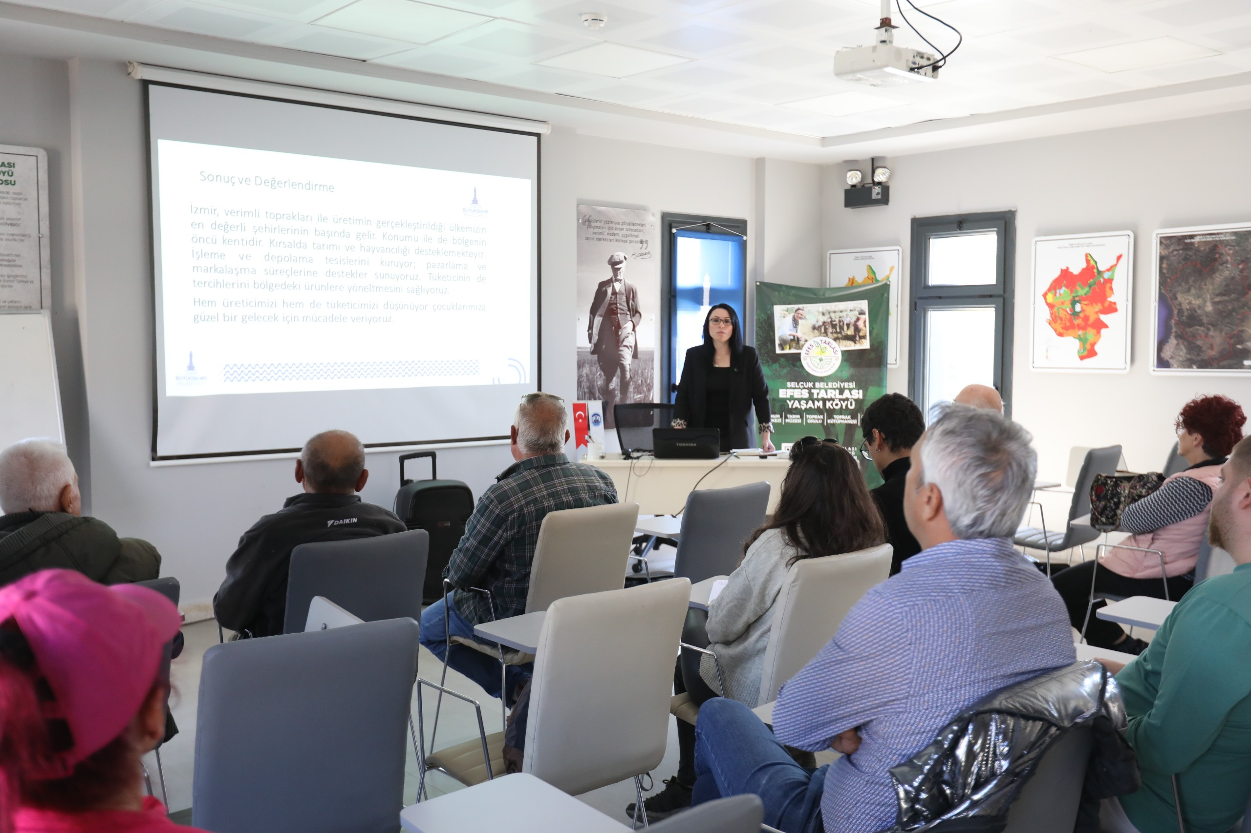 İzmir Büyükşehir Belediyesi Toprak Analiz Laboratuvarı Sorumlu Ziraat Yüksek Mühendisi Dr. Ayşen Duman, toprak verimliliğini artırmak amacıyla düzenlenen eğitimde İzmir’deki tarımsal alanların durumu, İzmir Büyükşehir Belediyesi Tarımsal Hizmetler Müdürlüğü’nün verdiği hizmetler, toprak analizinin önemi başlıkları altında bilgi verdi.