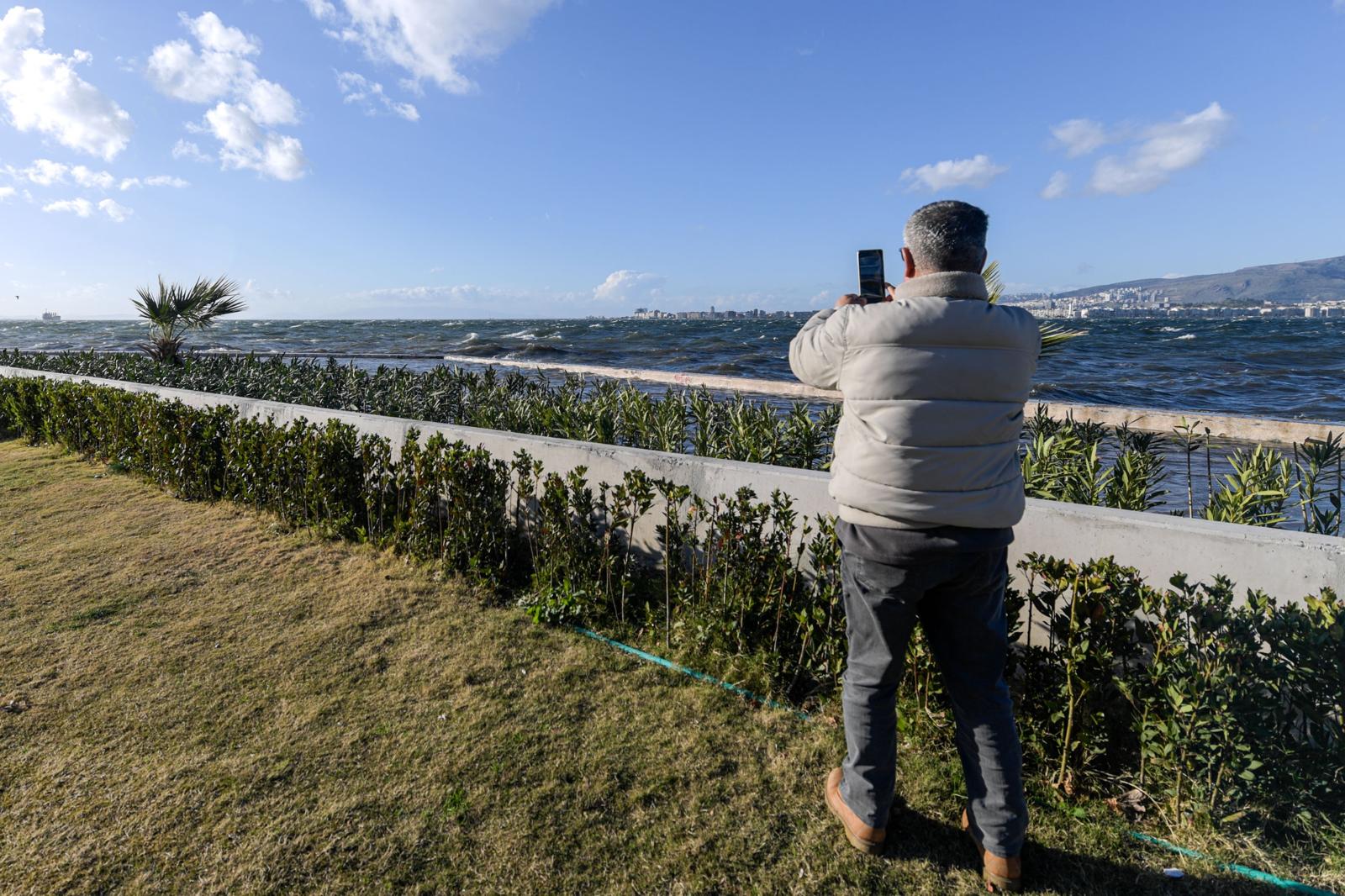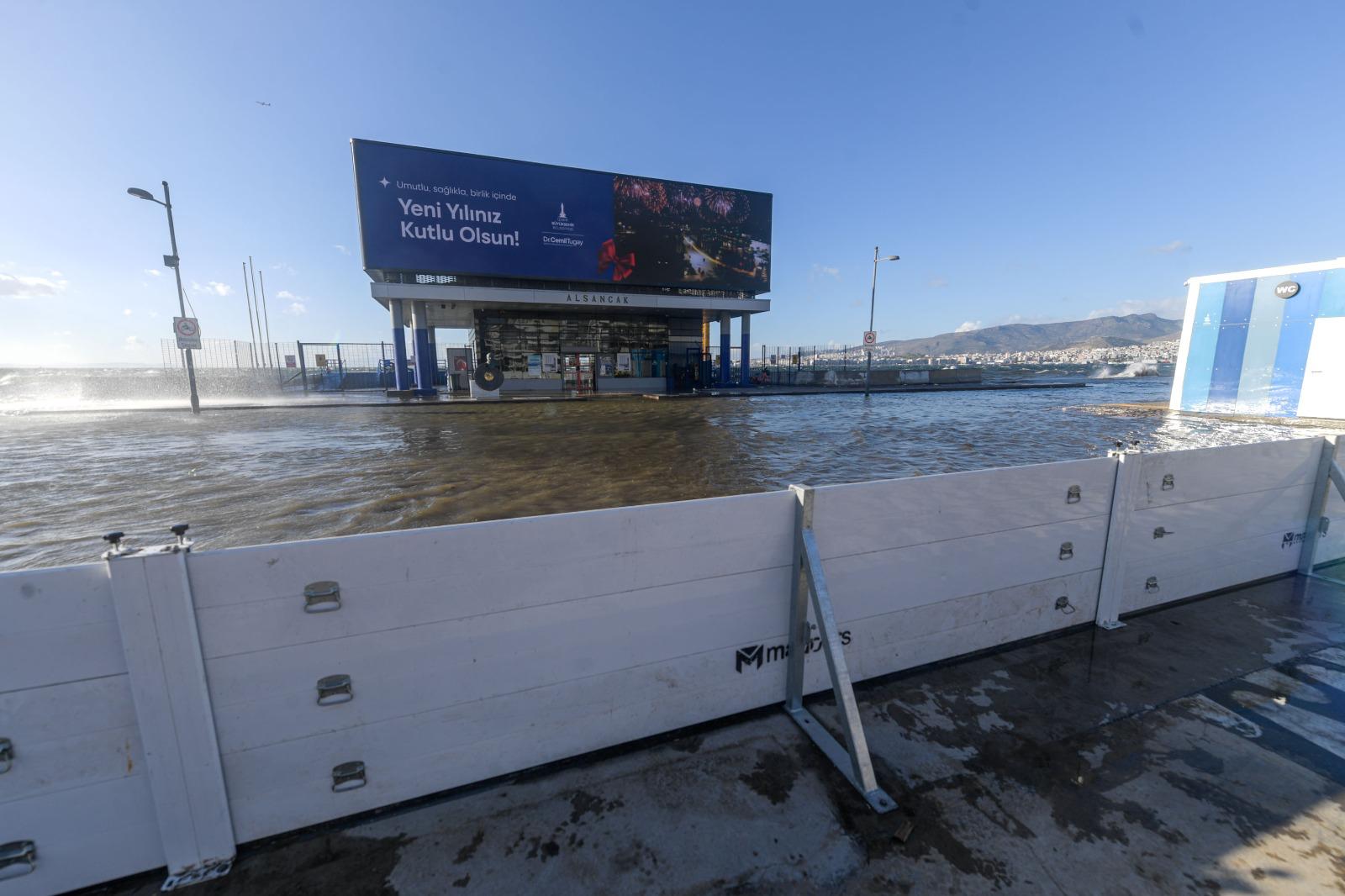 Alsancak Vapur İskelesi çevresinde deniz suyu yer yer kıyıyla birleşirken, Alsancak Limanı’ndan Cumhuriyet Meydanı’na kadar uzanan 1.700 metrelik kıyı şeridinde bulunan geçici fırtına duvarı olası büyük bir felaketin önüne geçti.