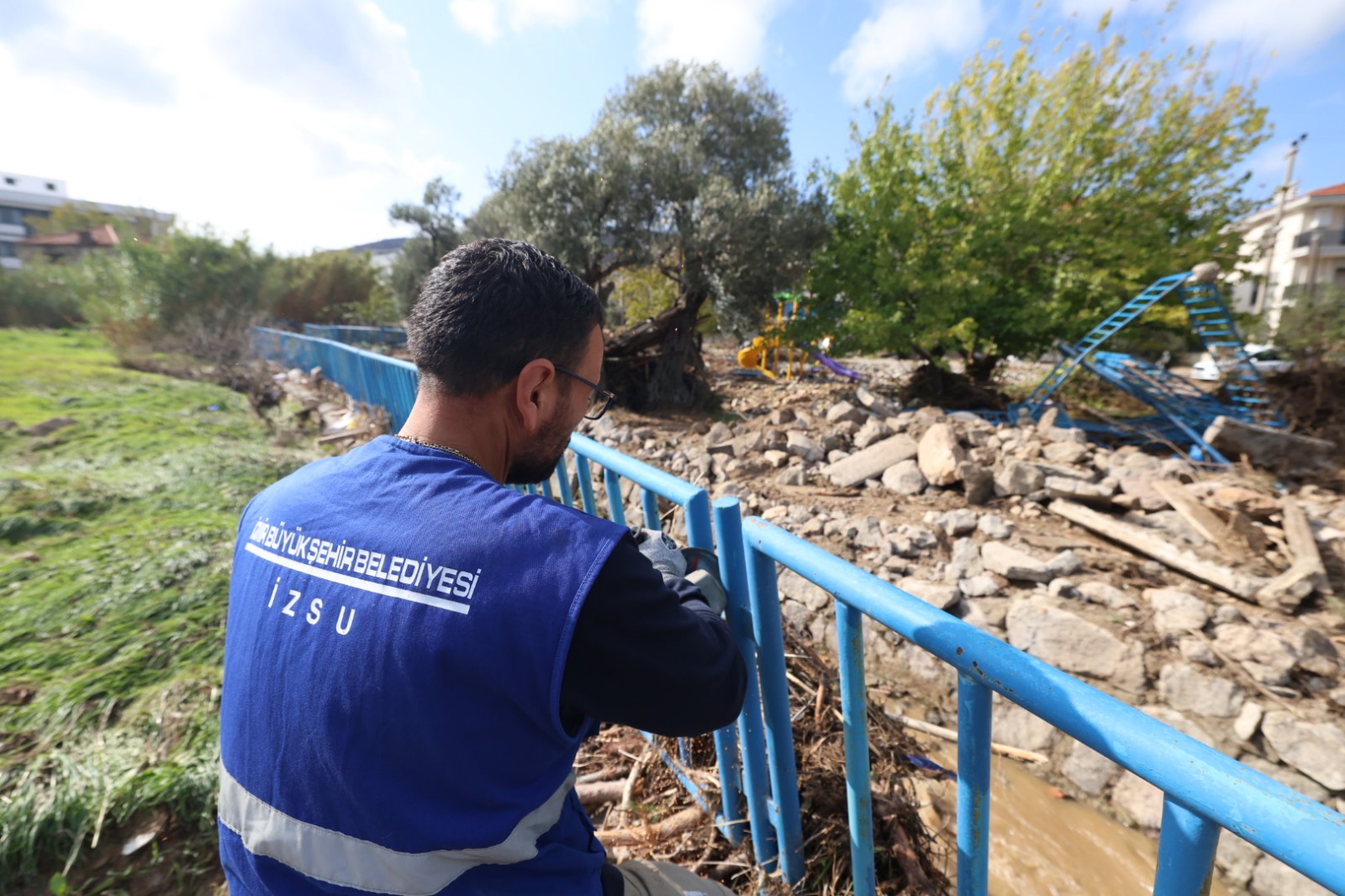Dağlık kesimlerden selle birlikte sürüklenerek dere yataklarını tıkayan ağaç dalları ve kaya parçalarının temizlenmesi için de yoğun çaba harcanıyor. Dağlardan taşınan toprakla tıkanan ızgaraların açılması için yoğun bir çalışma yürütülüyor. Ayrıca suyun şiddeti nedeniyle zarar gören dere yataklarının onarılması için İZSU ekipleri çalışmalara başladı.