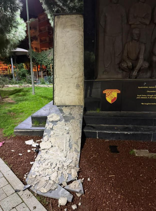 Geçtiğimiz günlerde Güzelyalı Fuat Göztepe Parkı içerisinde yer alan ve Göztepe’nin Avrupa’da yarı final oynayan efsane kadrosu ile takım antrenörü Adnan Süvari’yi simgeleyen anıta vandalist saldırı gerçekleşmişti.