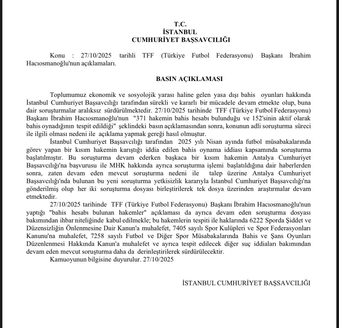 İbrahim Hacıosmanoğlu'nun açıklamalarının ardından İstanbul Cumhuriyet Başsavcılığı'ndan hakemlerin bahis skandalına ilişkin açıklama geldi. Dosyanın, hakemlerin MHK için yaptığı soruşturma ile birleştirileceği aktarılan açıklamada şu ifadelere yer verildi: