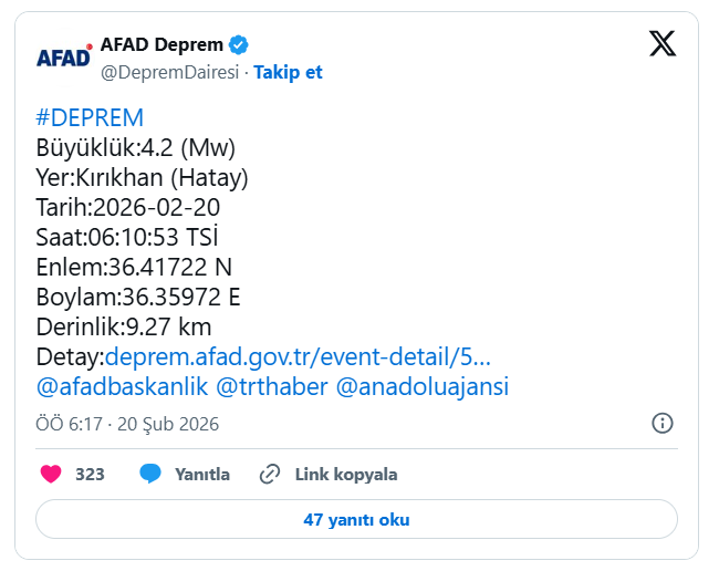 Afet ve Acil Durum Yönetimi Başkanlığı'nın (AFAD) internet sitesinde yer alan bilgiye göre, merkez üssü Kırıkhan ilçesi olan 4,2 büyüklüğünde sarsıntı kaydedildi.